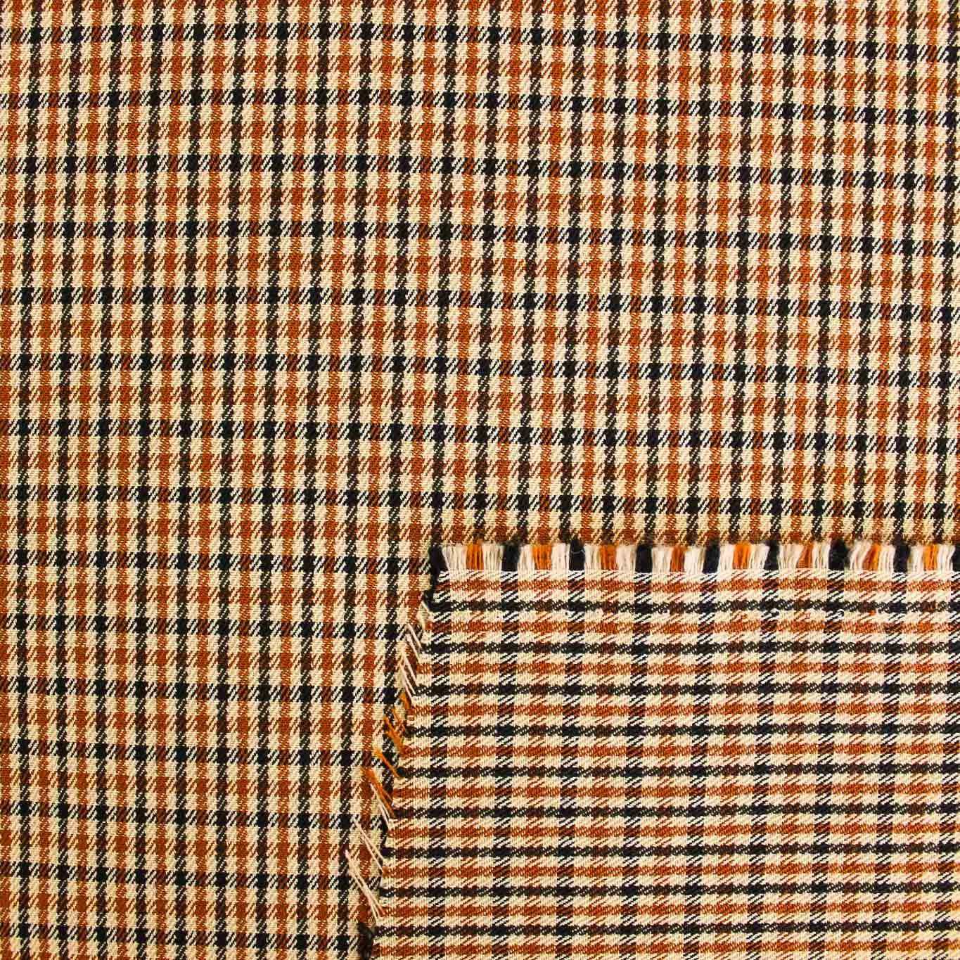Caldo tessuto mini scozzese di colore coccio, beige e nero. Tessuto in poliviscosa elasticizzato, dalla mano morbida e con una superficie liscia e opaca, è perfetto per creare capi d'abbigliamento originali da donna come completi: giacche e pantaloni, ma anche gonne o abiti .