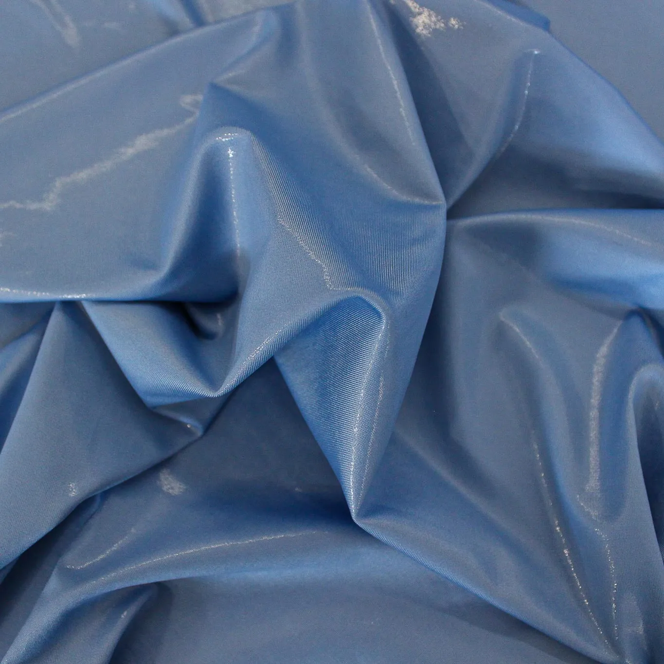 Luminosa maglina elasticizzata effetto spalmato di colore celeste. Il tessuto ha una mano morbida e una superficie lucida, ideale per realizzare capi d'abbigliamento come abiti, bluse e top.