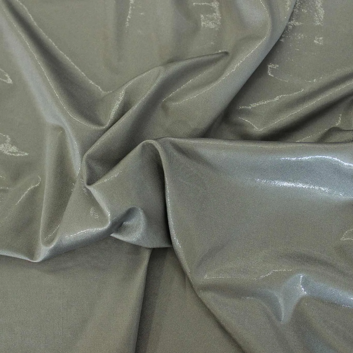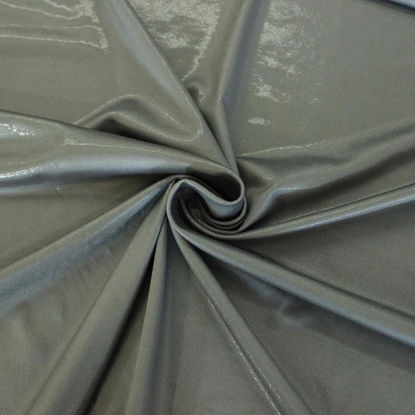 Luminosa maglina elasticizzata effetto spalmato di colore grigio. Il tessuto ha una mano morbida e una superficie lucida, ideale per realizzare capi d'abbigliamento come abiti, bluse e top.