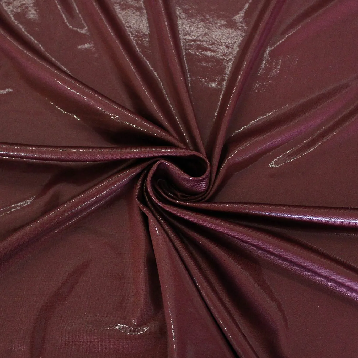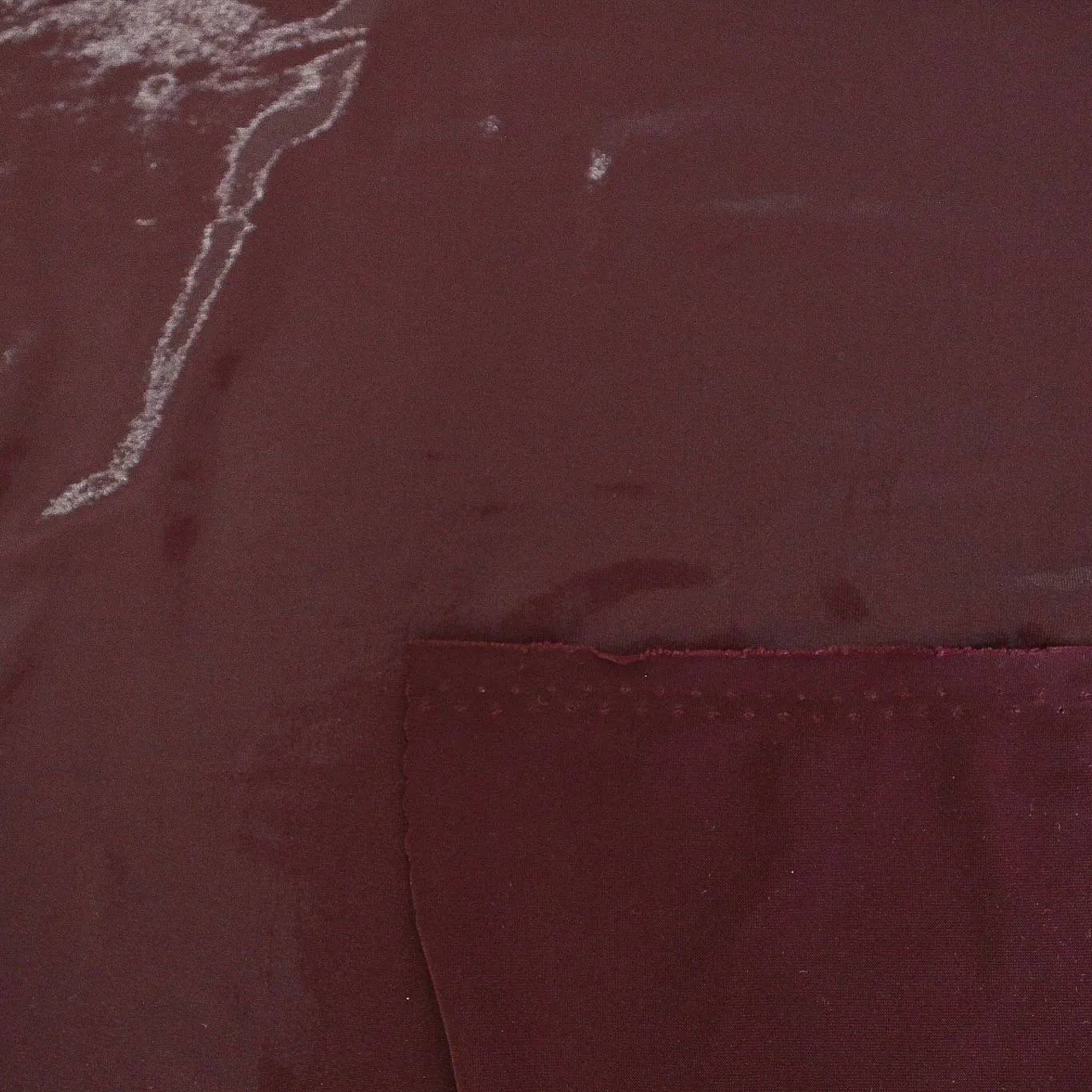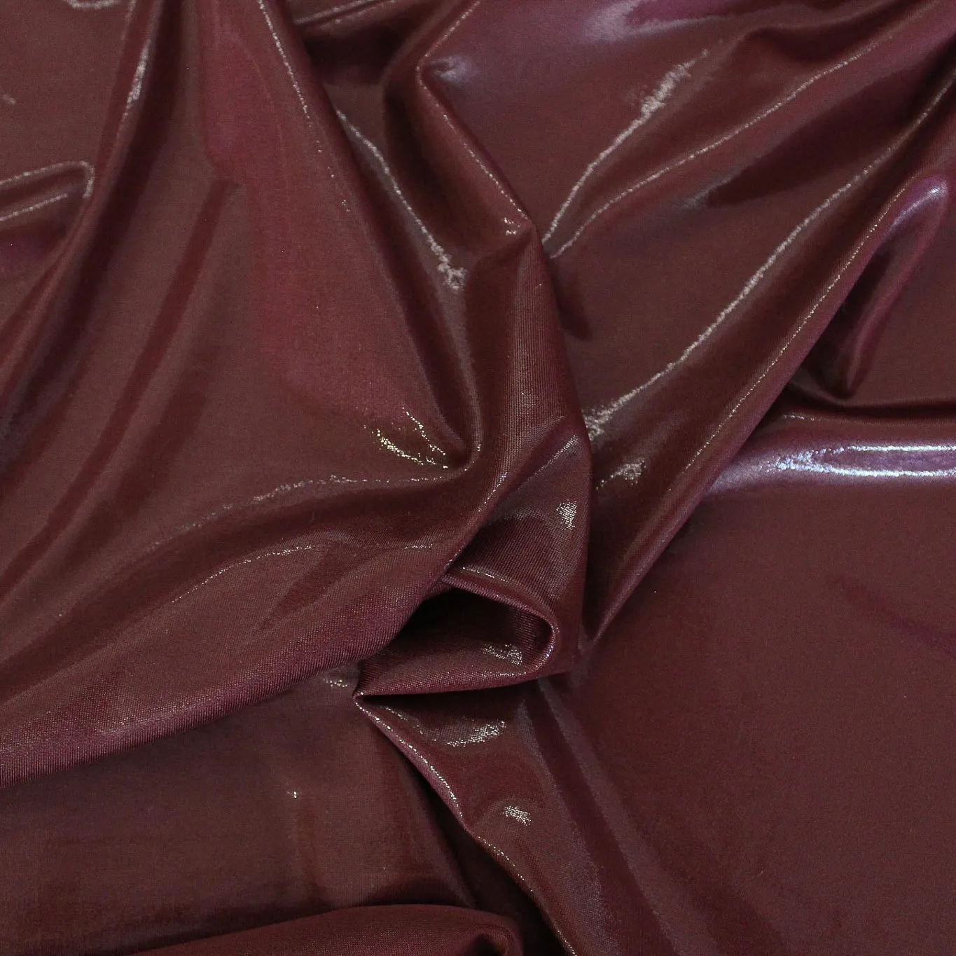 Luminosa maglina elasticizzata effetto spalmato di colore bordeaux. Il tessuto ha una mano morbida e una superficie lucida, ideale per realizzare capi d'abbigliamento eleganti come abiti, bluse e top .
