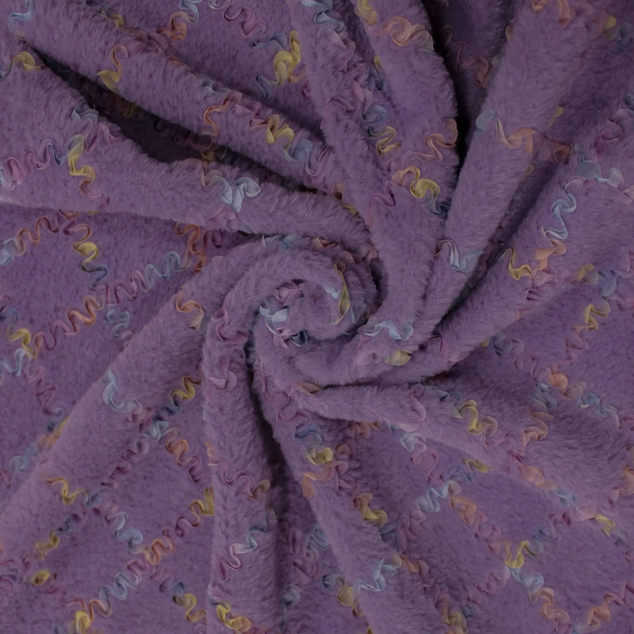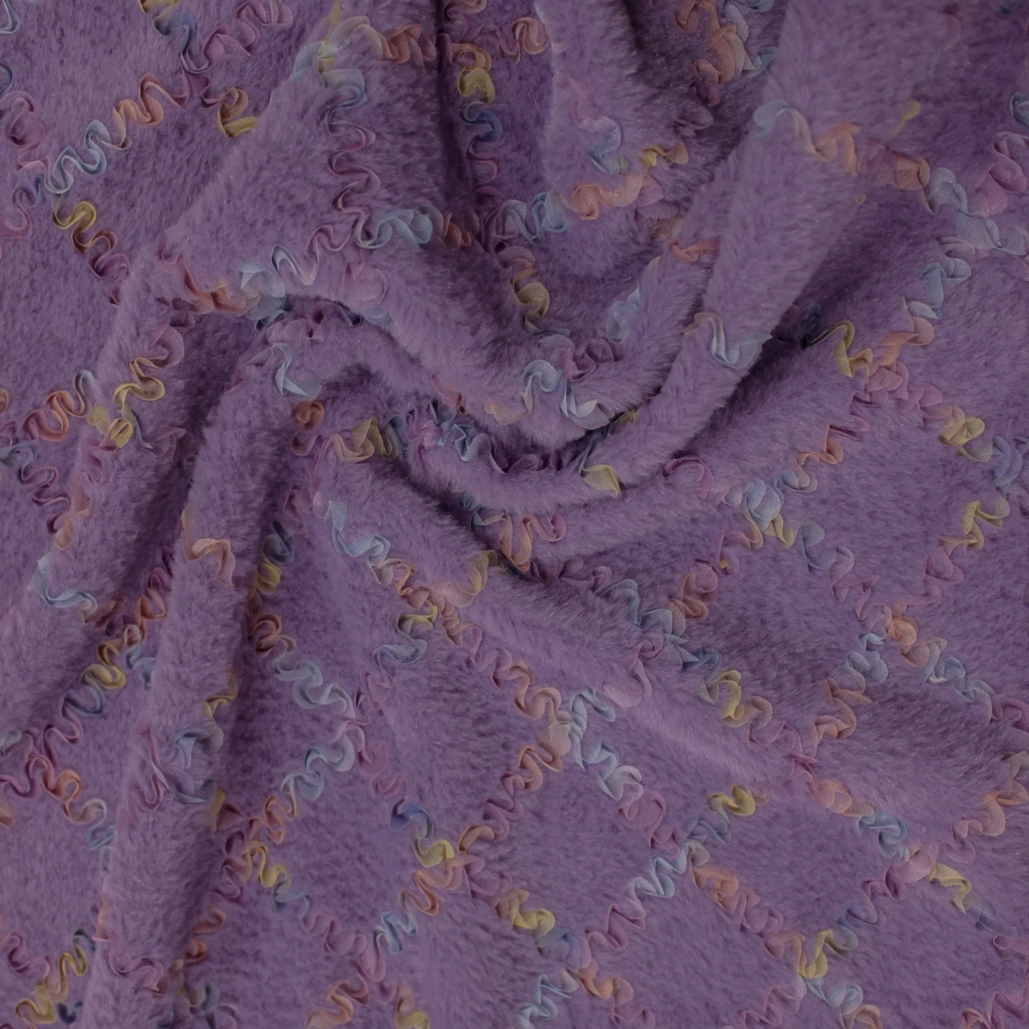 Originale tessuto in ecopelliccia di colore glicine con delicati intarsi in tulle multicolor dal motivo a rombi di circa 6x6 centimetri . Tessuto dalla mano molto morbida e soffice , liscia sia interamente che esternamente, con una superficie lucente. Ideale per realizzare caldi capi invernali prevelantemente da bambina come cappottini ,giacche ,cappe, cappellini o progetti fai da te .