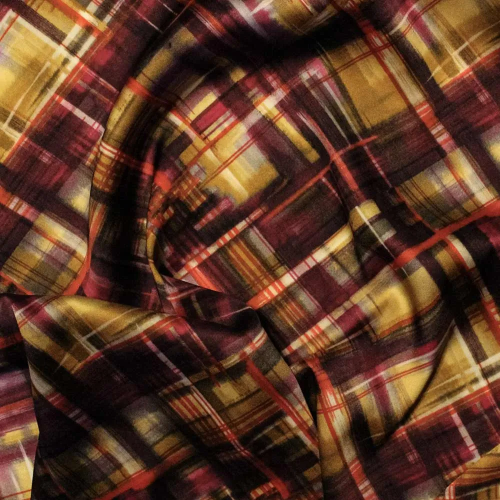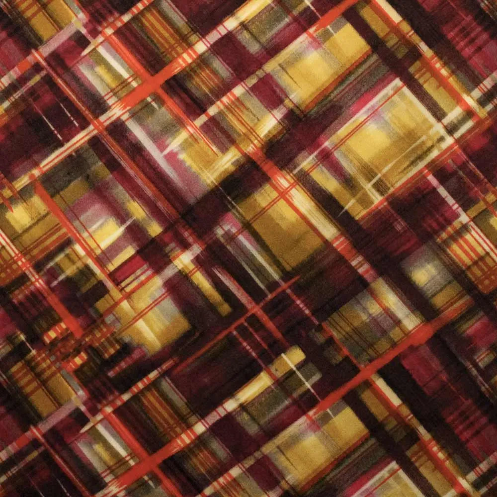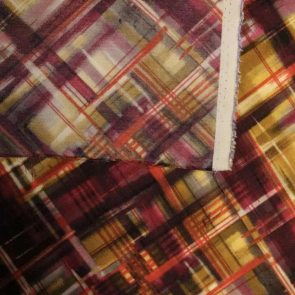 Splendido tessuto in raso stratch fantasia astratta a quadri di colore viola, giallo, nero. Tessuto stampato con tecnica digitale made in italy. Tessuto ideale per realizzare abiti, gonne o camicie glamour. Realizza il tuo nuovo progetto con questo tessuto .
