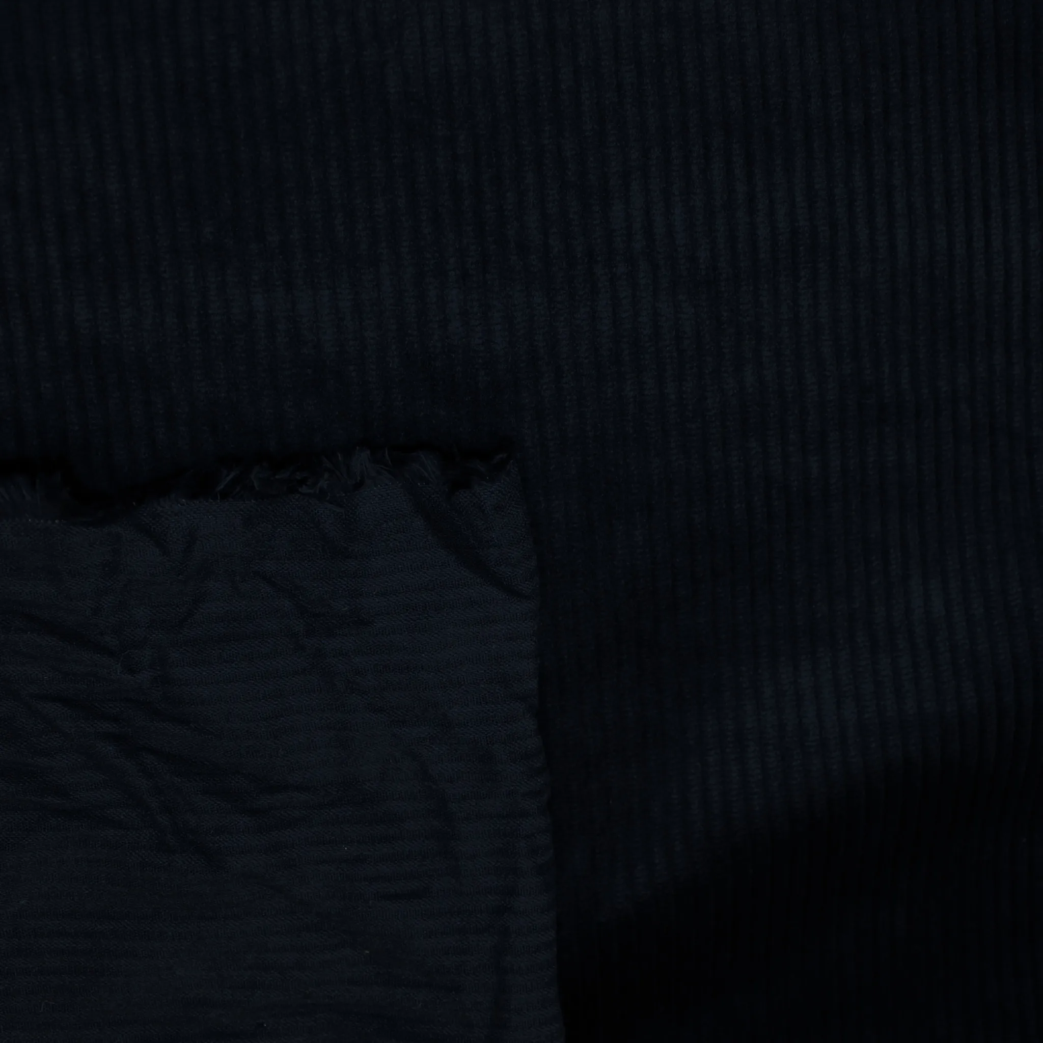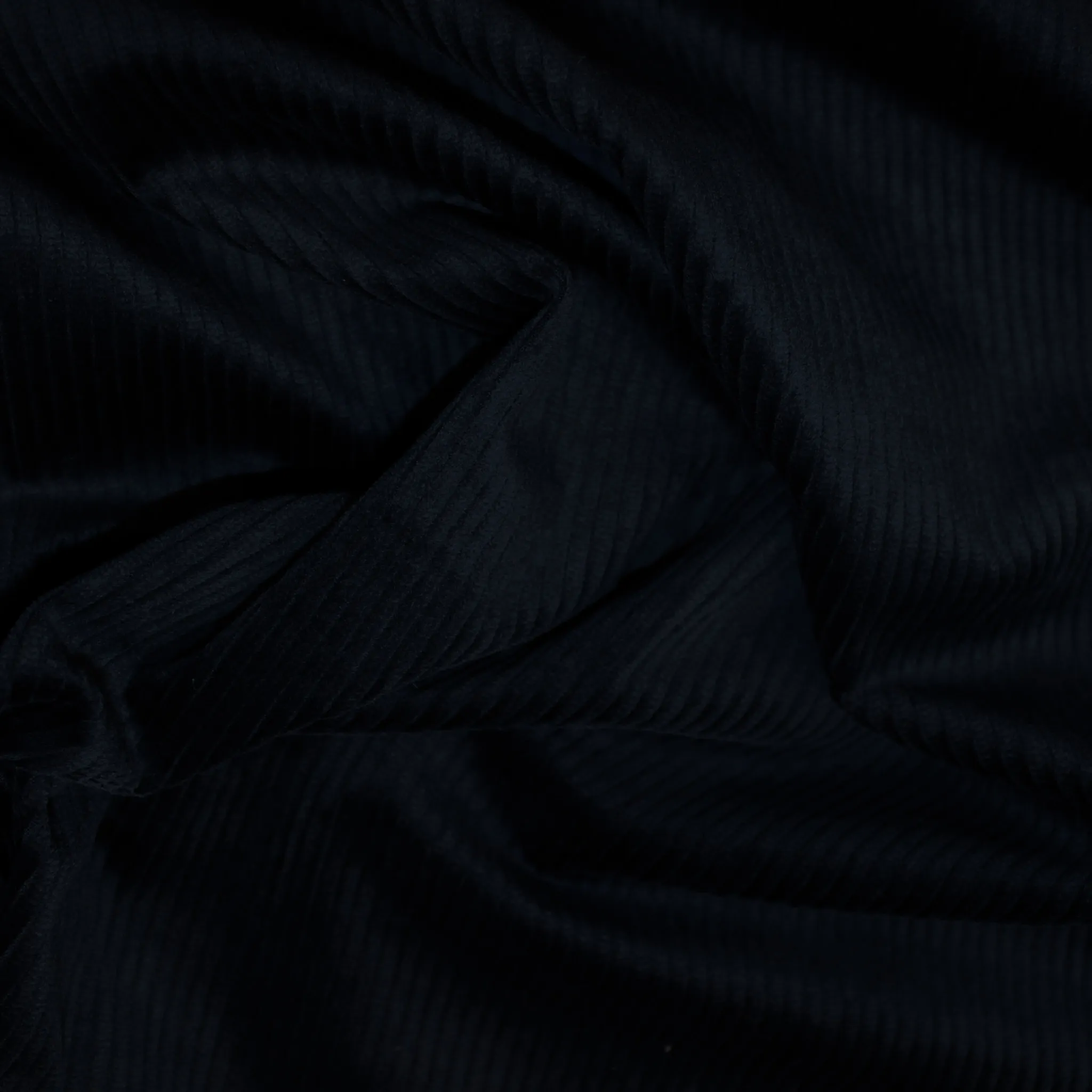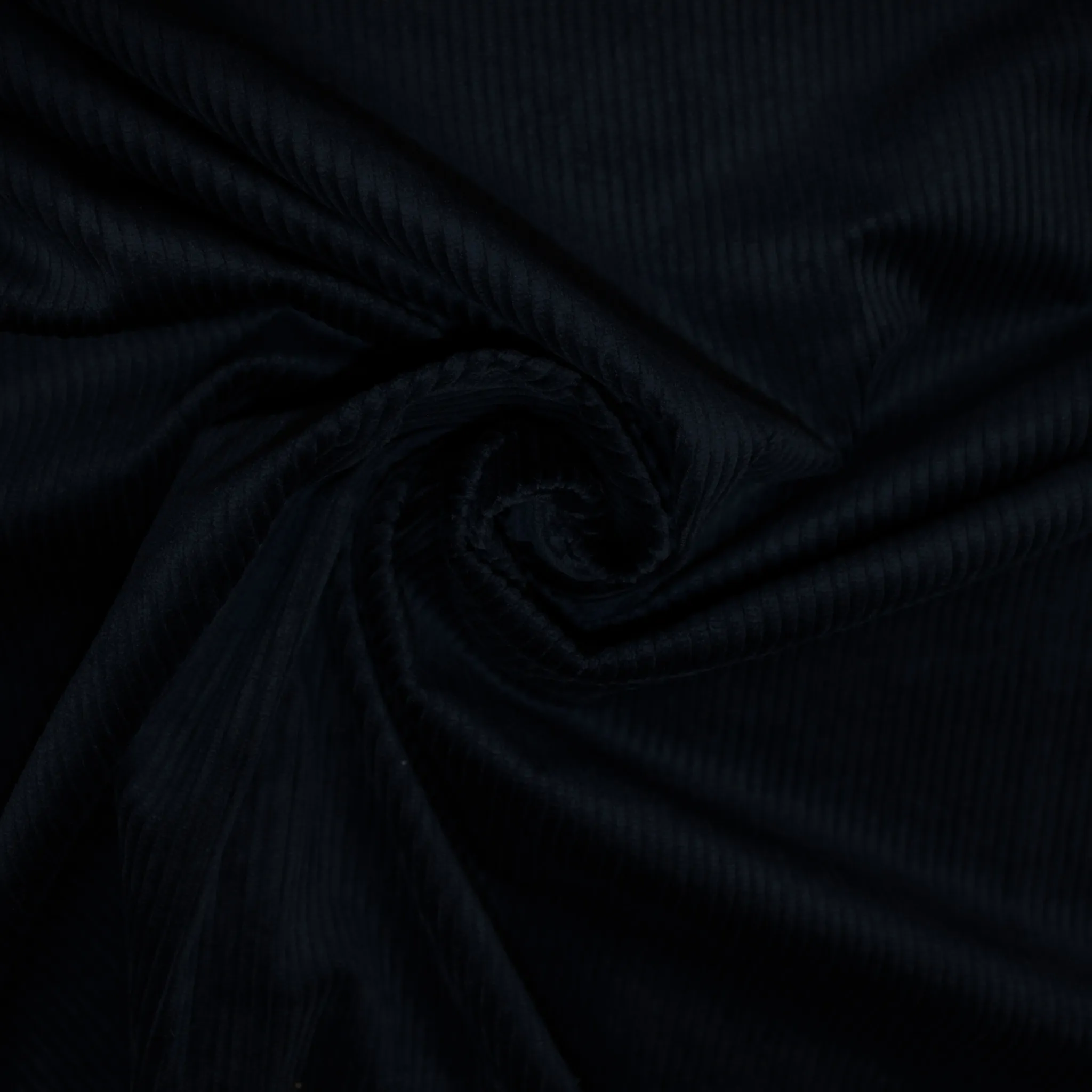 Morbido tessuto in velluto a coste di colore blu scuro leggermente elastico ideale per giacche, pantaloni, abiti o gonne uomo donna e bambini .Dal peso medio perfetto per la stagione invernale .