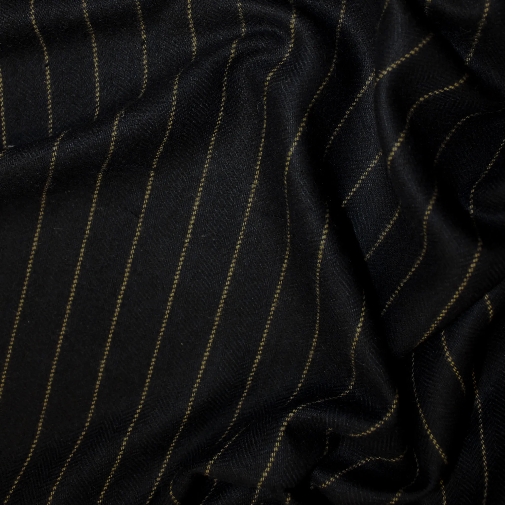 Tessuto gessato in poliviscosa fisso di colore blu scuro con filo nero in trama e una riga color cammello che ha una distanza di 2 cm dall'altra . Il tessuto ha una mano liscia, fluida e con una superficie opaca ; risulta ideale per realizzare capi d'abbigliamento autunno- inverno come giacche, pantaloni e gonne da donna ma anche top o gilet .Tessuto Made in Italy