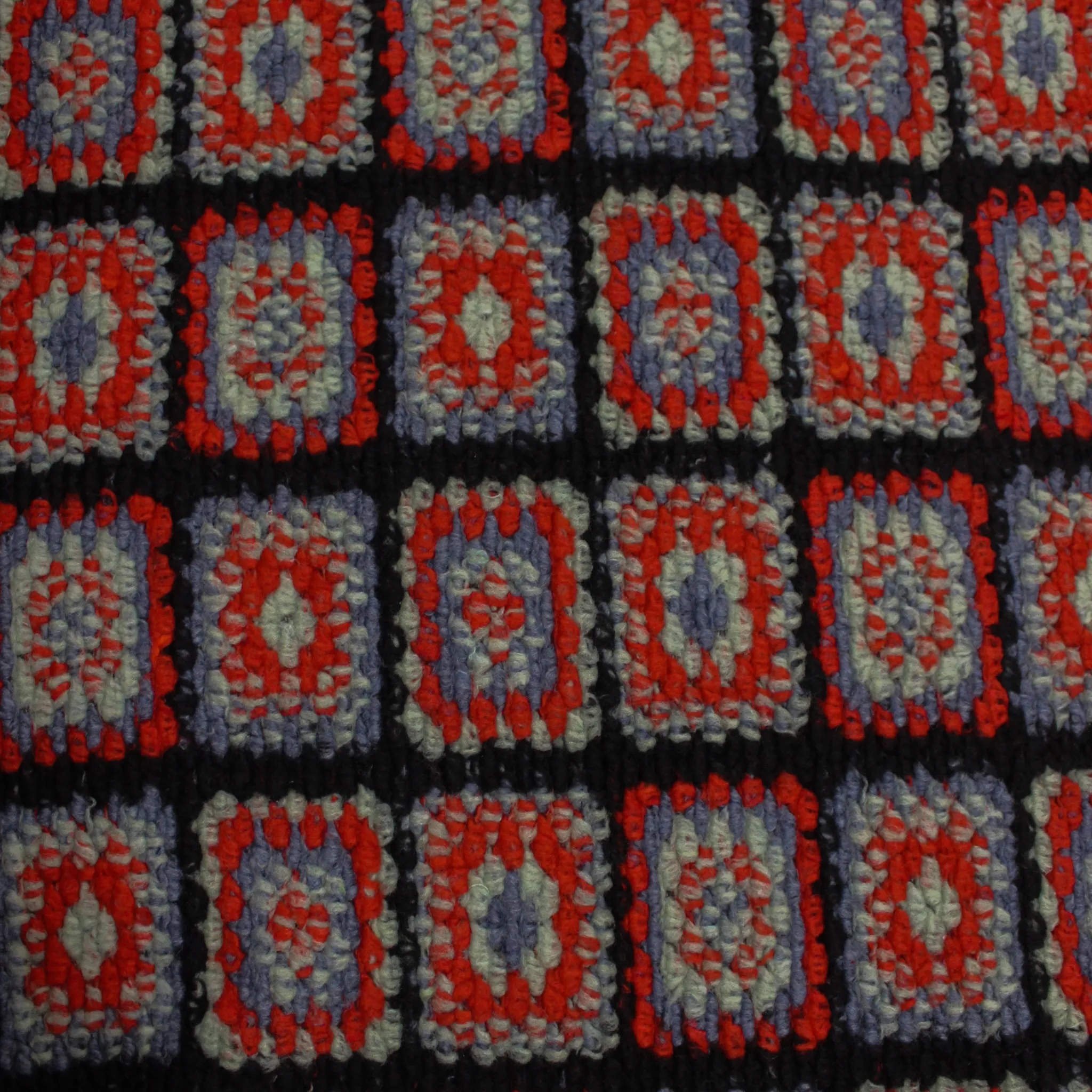 Originale tessuto in misto lana effetto uncinetto con motivo quadri di diversi colori: rosso, verde salvia, azzurro su base nera.
