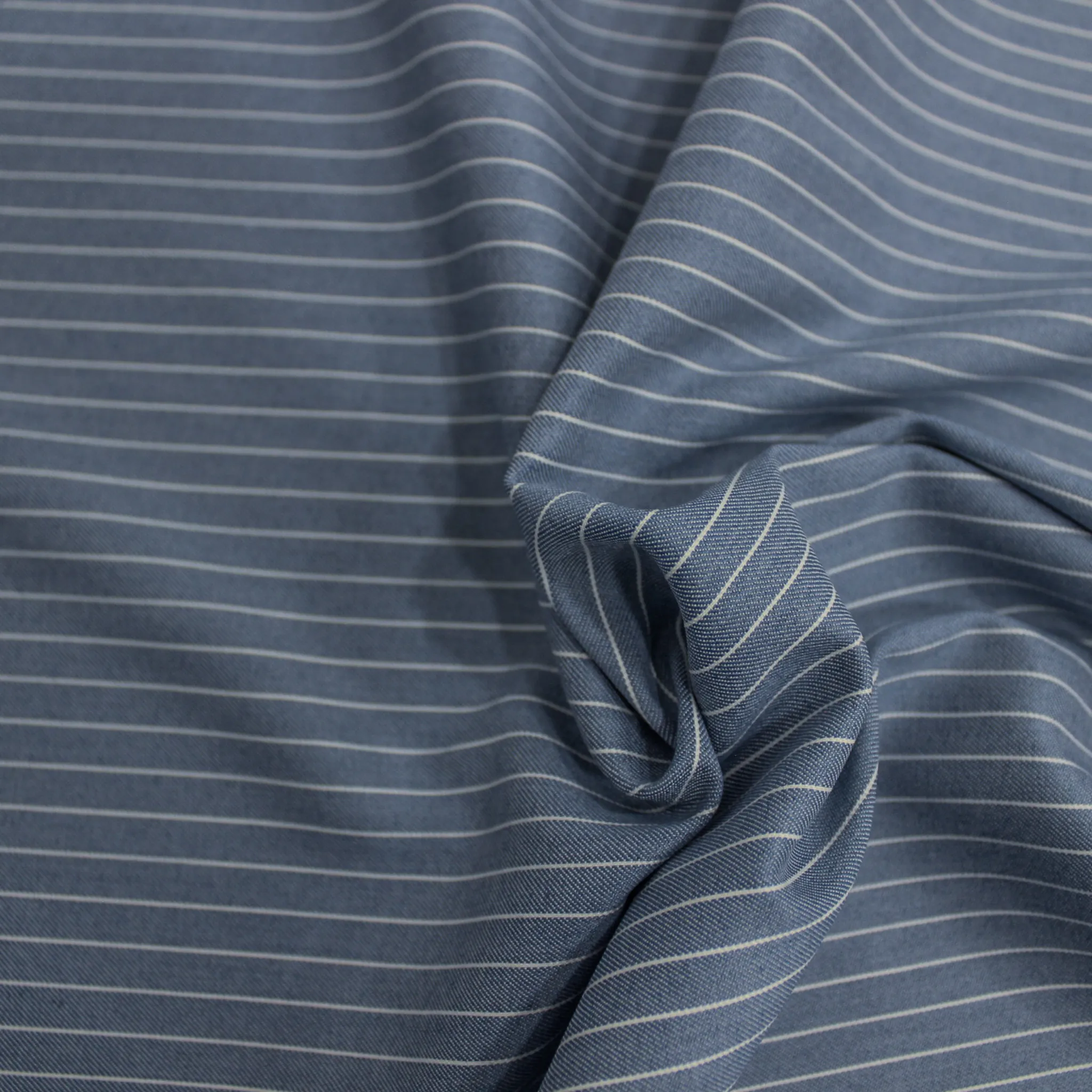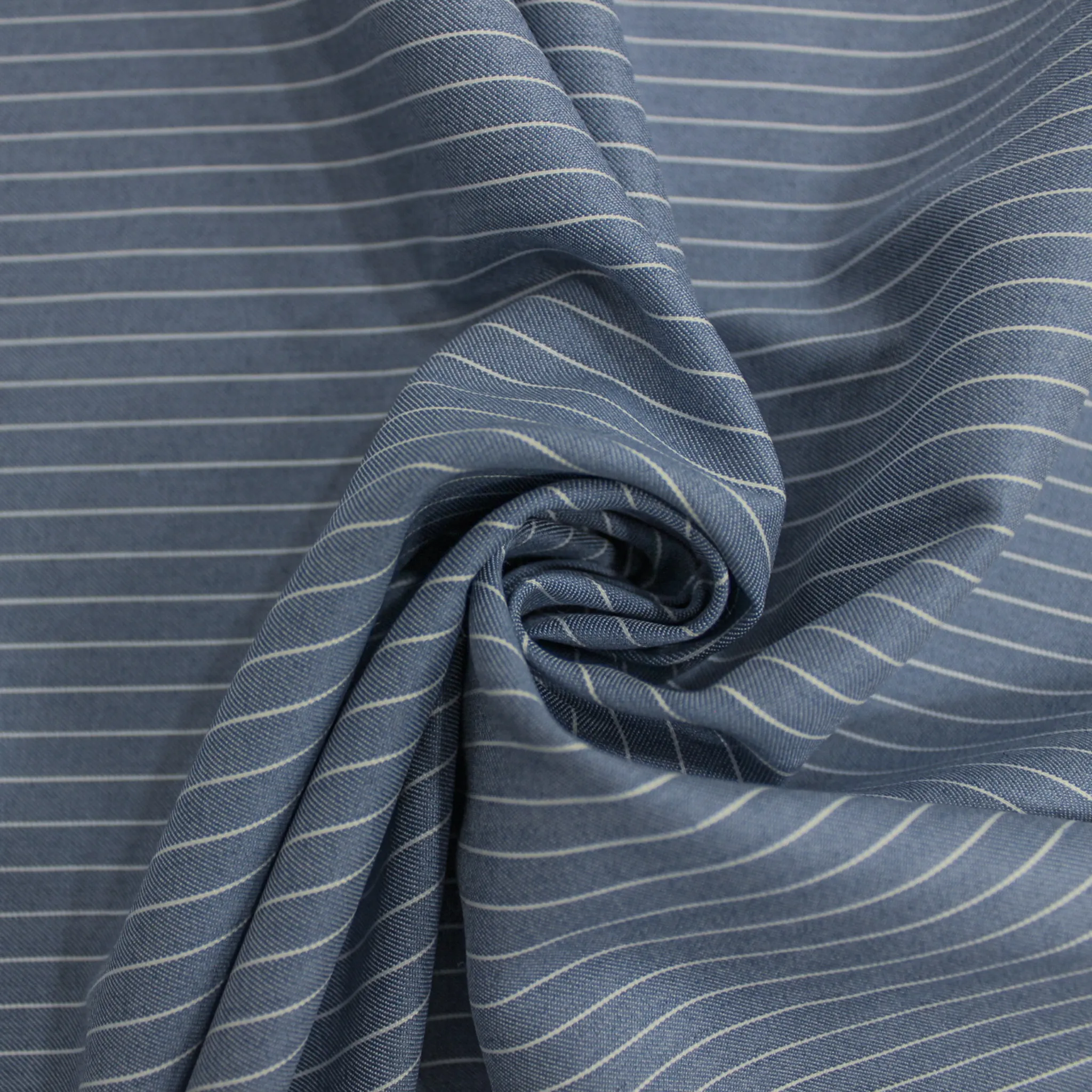 Tessuto gessato in poliviscosa elasticizzata di colore blu con righe bianche che distano 1 cm. Il tessuto ha una mano liscia, fluida ed ha una superficie opaca e compatta ; risulta non trasparente ,ideale per realizzare capi di capi di abbigliamento per la primavera ed estate donna o bambini ma anche uomo come completi giacca e pantalone , gonne , top o abiti e tanto altro .