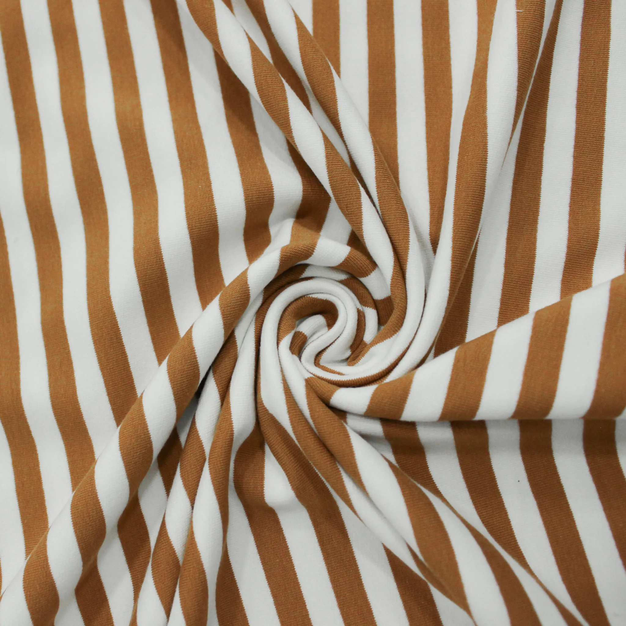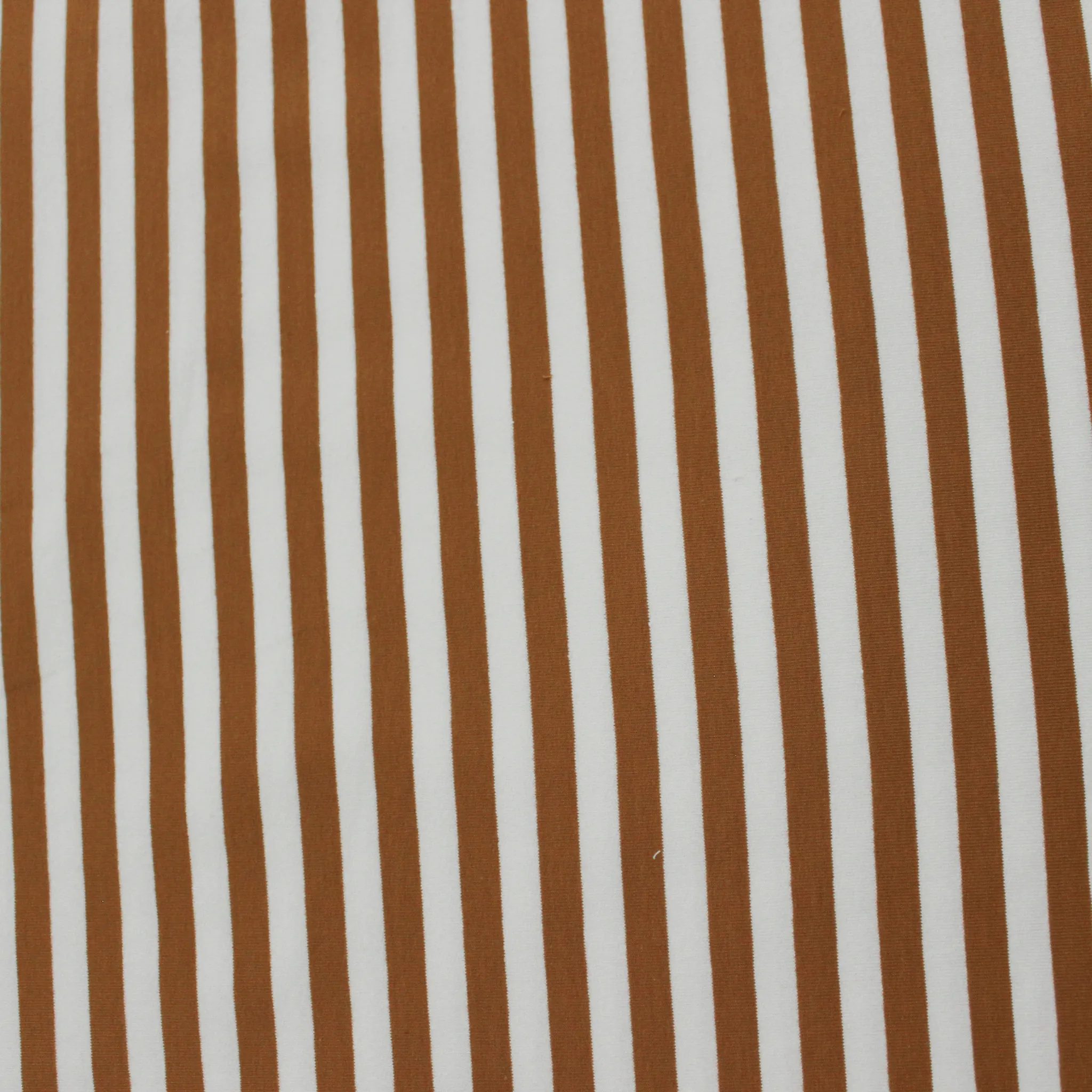 Morbido tessuto di felpa elastica estiva di cotone di colore bianco con righe tabacco, ideale per la stagione primavera estate. Le righe hanno una larghezza di 1 centimetro. Realizza capi d'abbigliamento come felpe e t-shirt uomo, donna e bambino .