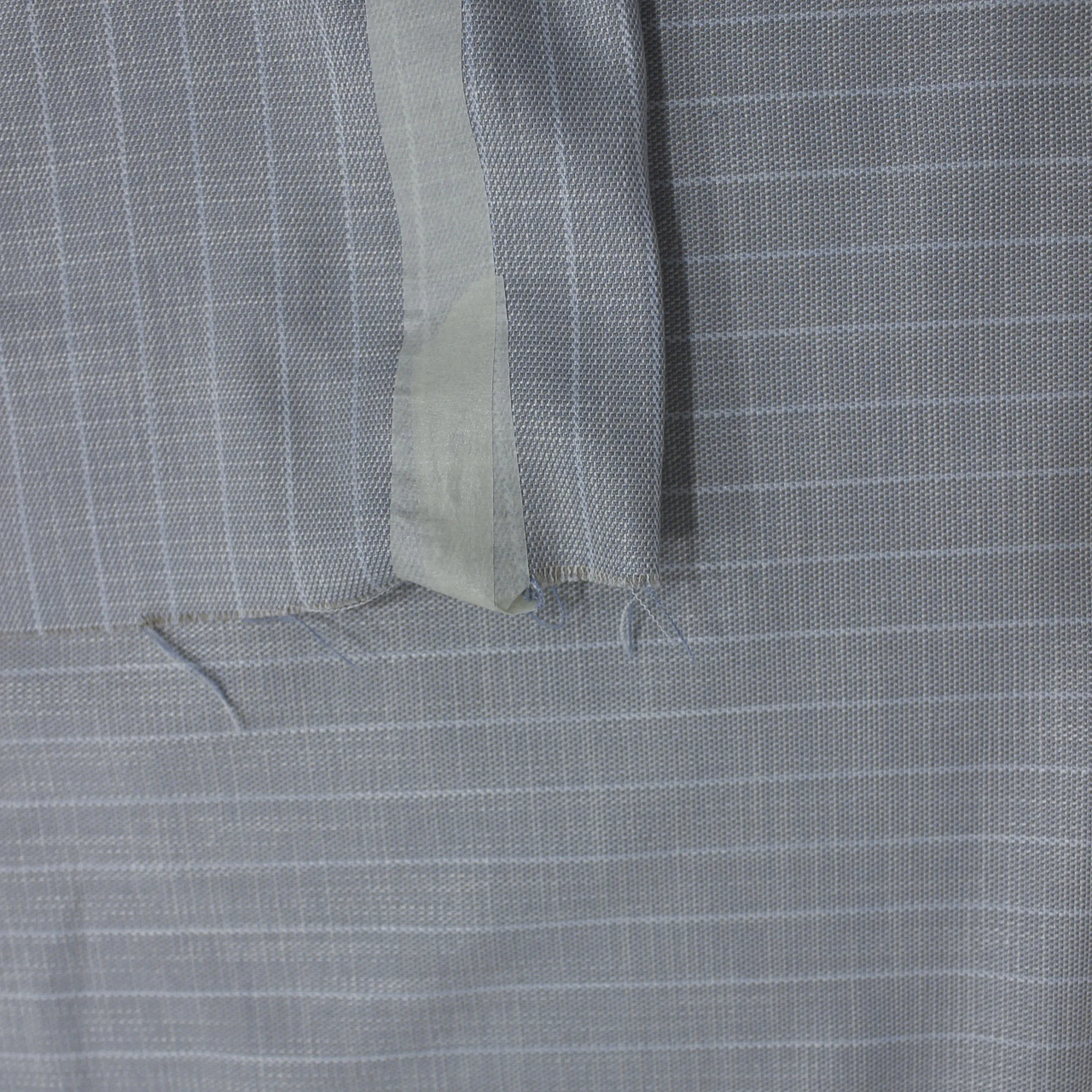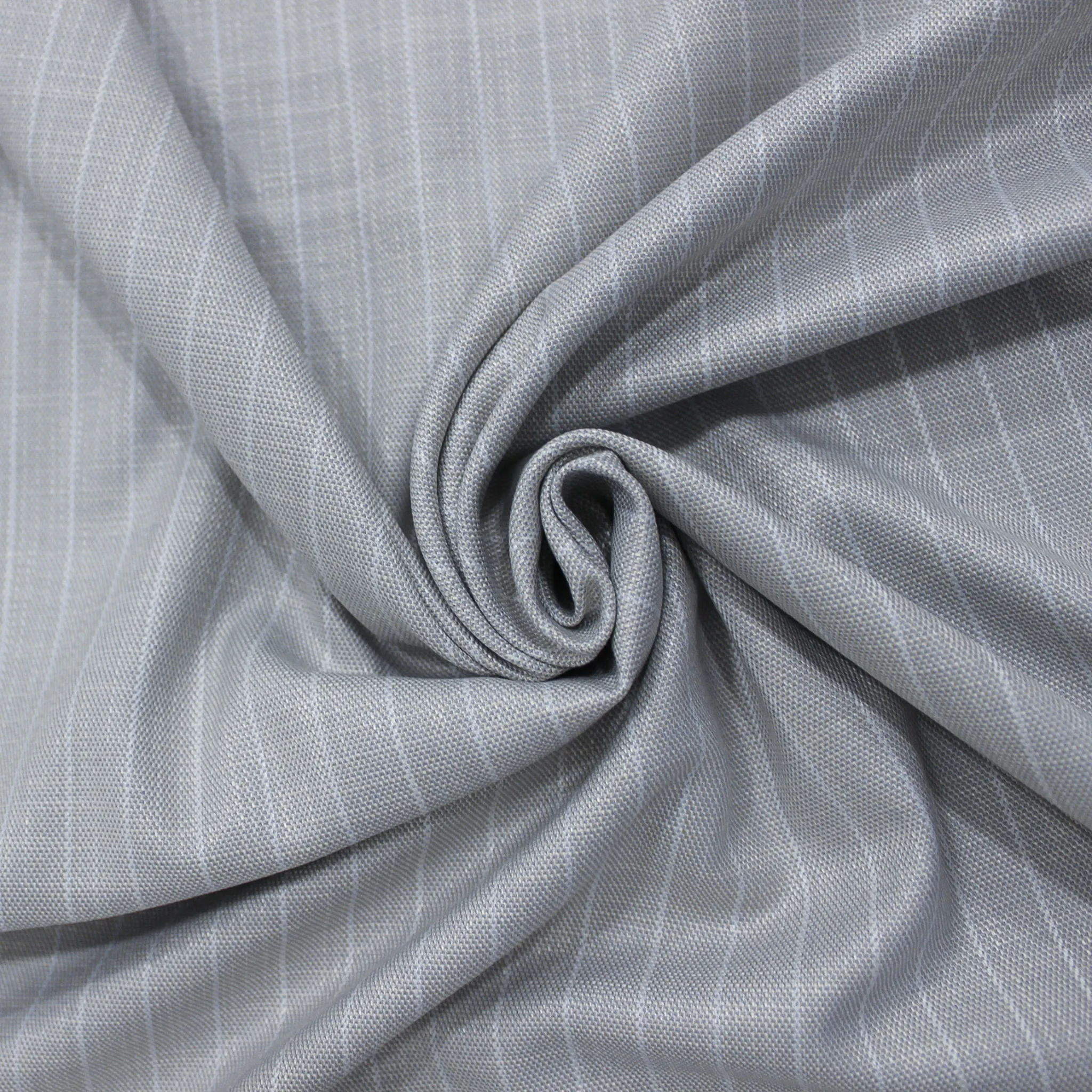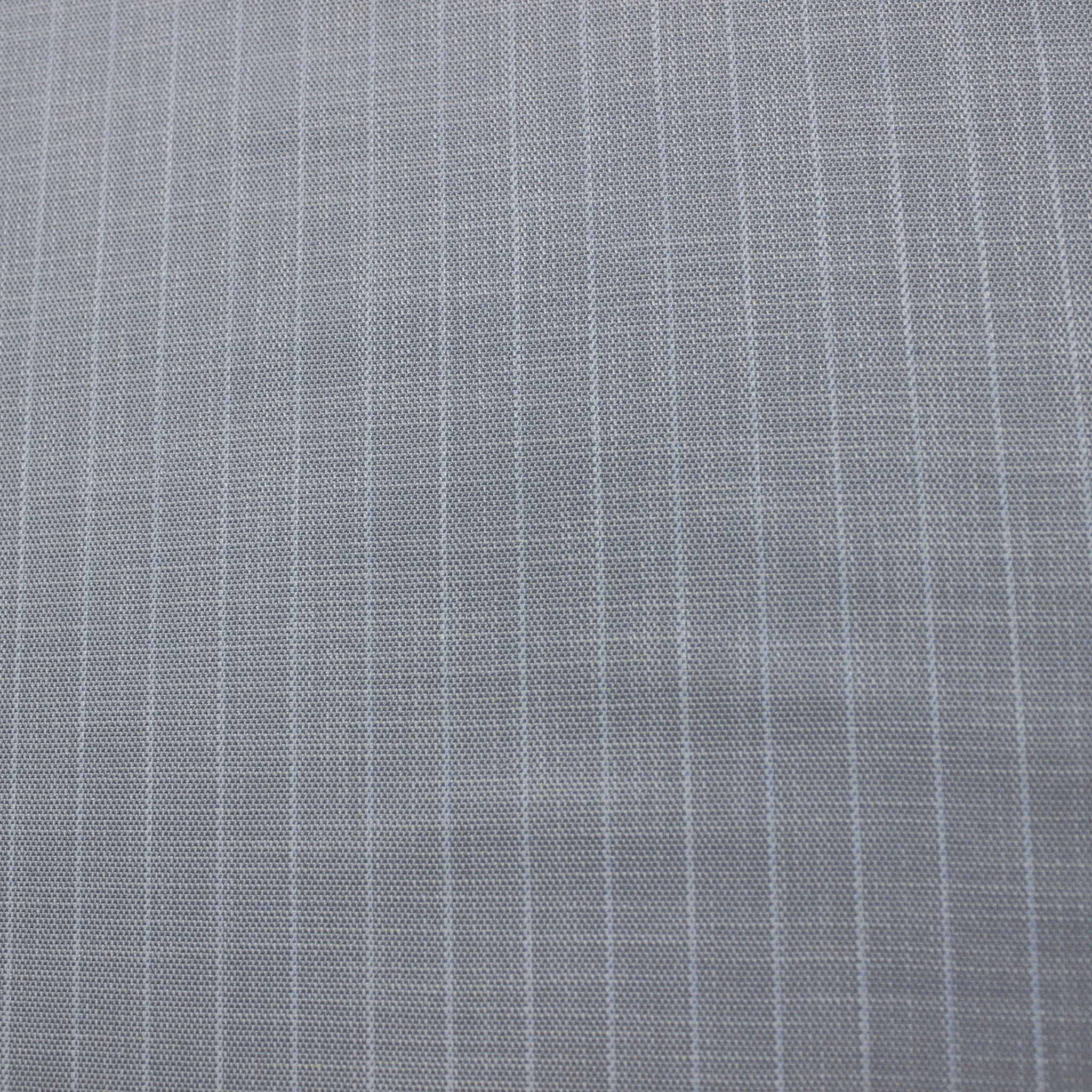 Originale gessato in poliviscosa leggermente elasticizzato nel colore grigio perla e celeste polvere con rigatura bianca molto sottile che ha una distanza di circa 1,5 centimetri l'una dall'altra. Il tessuto ha un leggero effetto perlato con ha una mano liscia, fluida e con una superficie compatta e leggermente lucente ; risulta non trasparente , ha un' effetto melange,ideale per realizzare capi d'abbigliamento per la primavera ed estate uomo , donna o bambini come completi : giacca e pantalone , gonne , top o abiti.