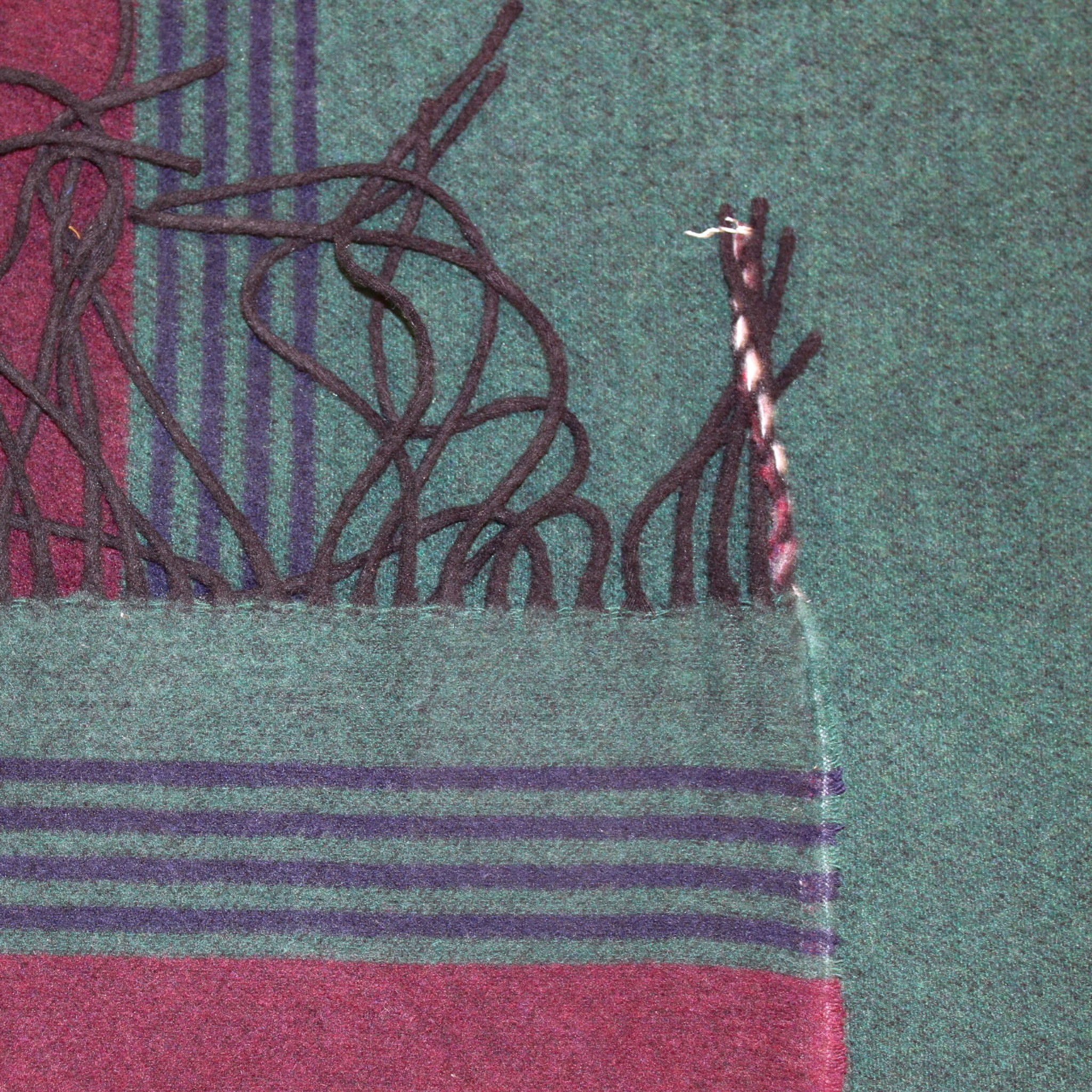 Tessuto misto lana deadstock di alta qualità, con balza decorativa bordeaux e blu su entrambi i lati. Il pannello misura 2 metri in lunghezza, mentre la balza laterale è larga 25 cm, perfetta per creare dettagli eleganti e strutturati. La base verde con texture mossa e le righe verticali donano carattere e profondità al tessuto. Ideale per confezionare mantelle, cappotti, poncho e capi outerwear dallo stile unico e artigianale. La composizione in misto lana garantisce calore, morbidezza e resistenza, rendendolo perfetto per la stagione autunno/inverno.