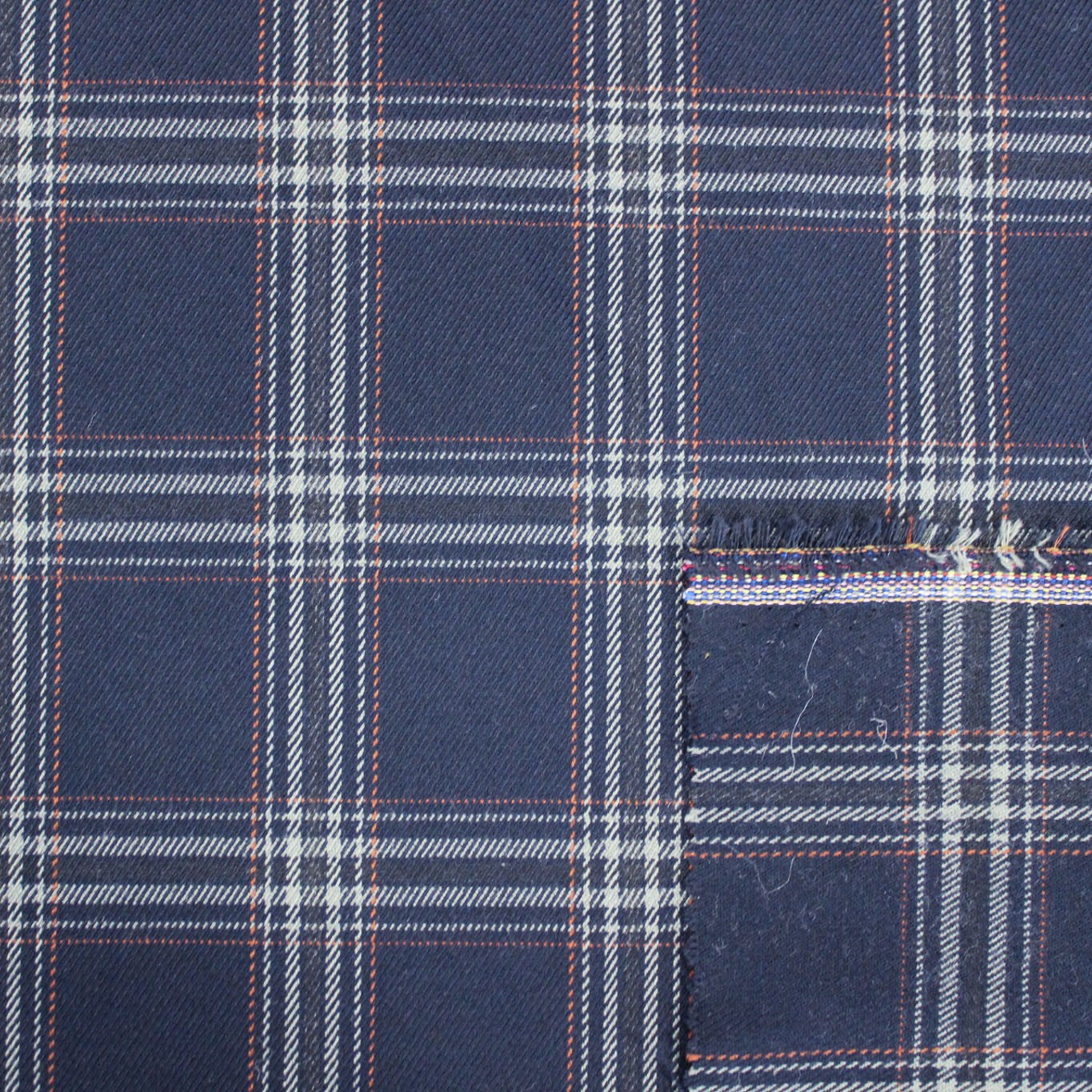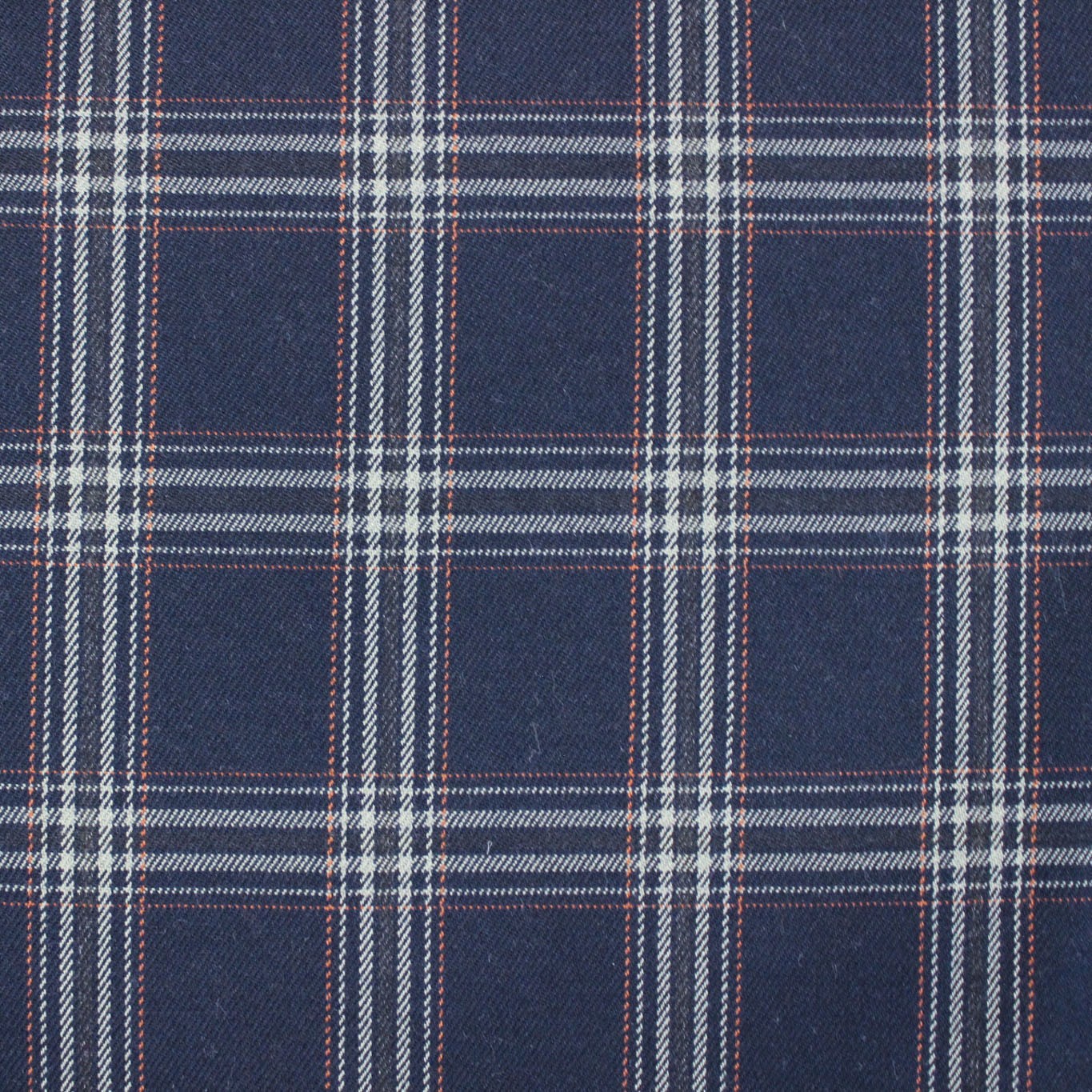 Tessuto scozzese con fondo blu, arricchito da quadri regolari da 8 cm nei toni del grigio e dell' arancio. La fantasia tartan, elegante e decisa, dona carattere a ogni creazione sartoriale. La composizione in 65% poliestere, 32% viscosa e 3% elastan garantisce comfort, elasticità e resistenza. Morbido al tatto e facile da lavorare, è ideale per gonne, pantaloni, giacche leggere, abiti casual e accessori moda per la stagione autunno/inverno