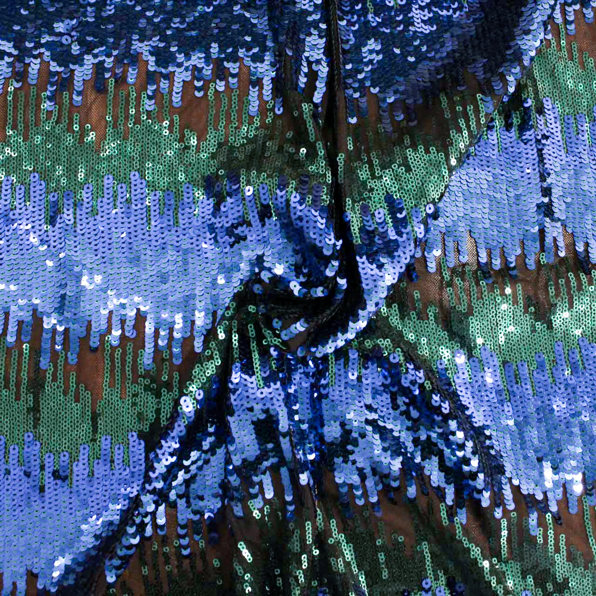 Elegante tessuto pailettes fantasia astratta di colore blu royal e verde, base tulle elasticizzato nero. Tessuto ideale per realizzari capi esclusivi come abiti, top.