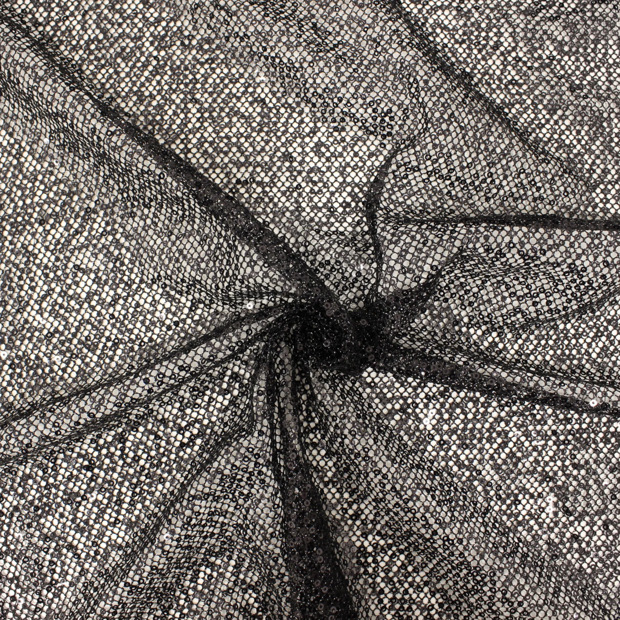 Luminoso tessuto a rete colore nero con micro paillettes nere che lo inpreziosiscono. Perfetto per realizzare capi d'abbigliamento sofisticati come abiti eleganti o grintosi top e gonne .Il tessuto si presenta trasparente e molto particolare .