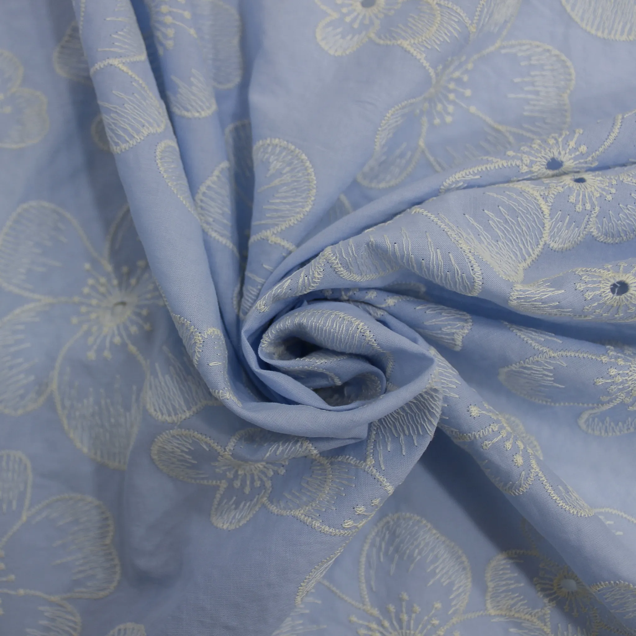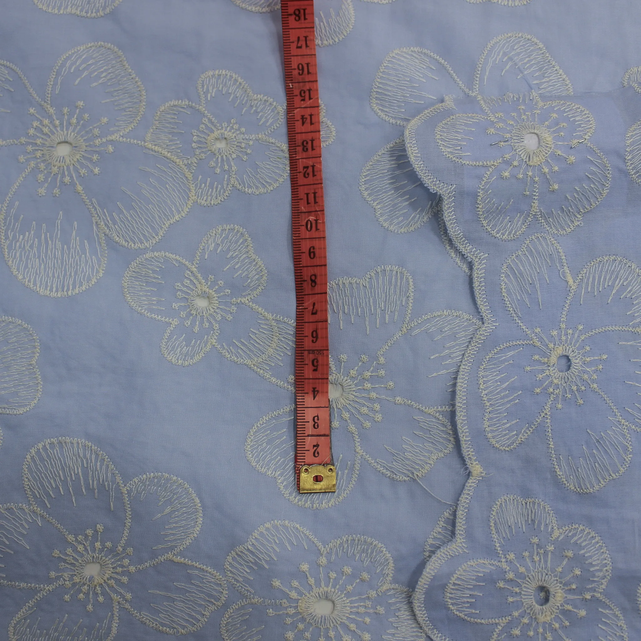Fresco ed originale tessuto pizzo san gallo smerlato da ambo i lati di colore celeste in 100% cotone traforato con ricami floreali in cotone panna ,che hanno un diametro di circa 6 centimetri . Il tessuto è ideale per la realizzazzione di capi donna e bambini per la stagione primavera -estate come abiti , camicie,gonne, copricostume, completi top e pantalone e tanto altro .