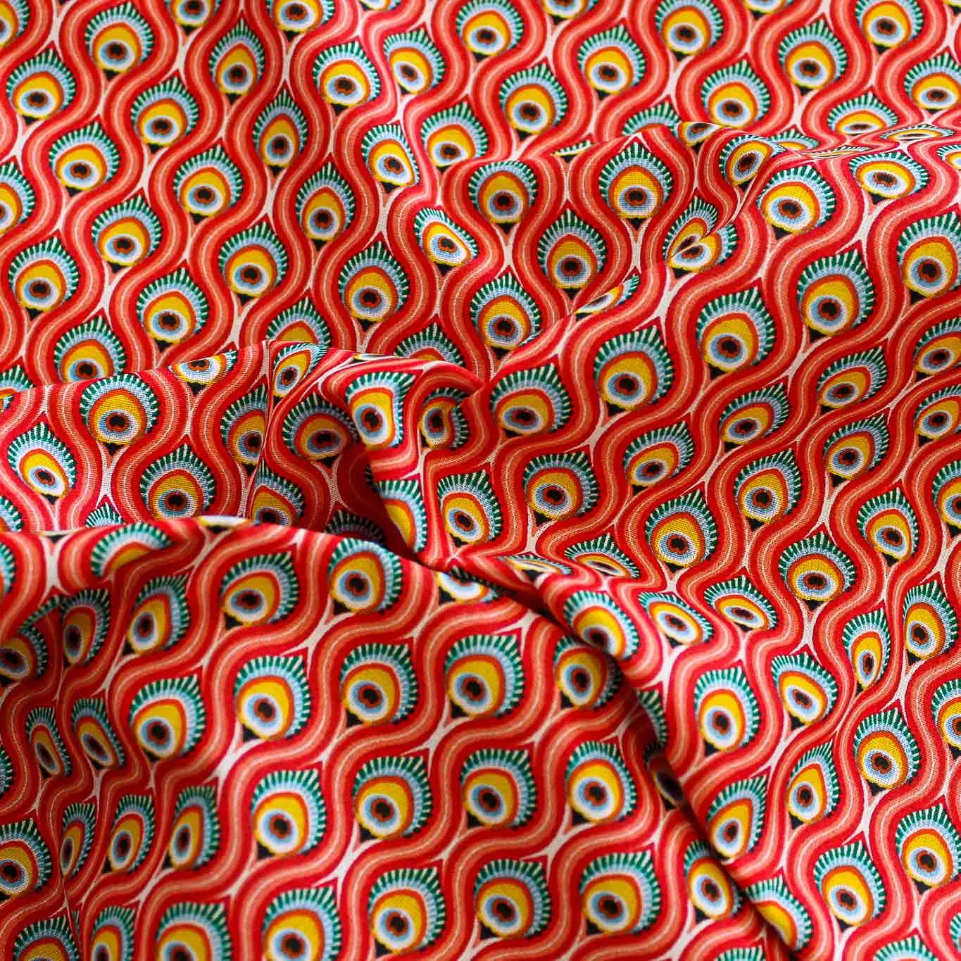 Morbido tessuto in cotone con fantasia astratta, onde di colore rosso che racchiudono disegni multicolor. Ideale per realizzare capi per bimbi, lenzuola o per progetti fai da te. Mano morbida e liscia, fresco e pratico. Tessuto certificato OEKO-TEX.