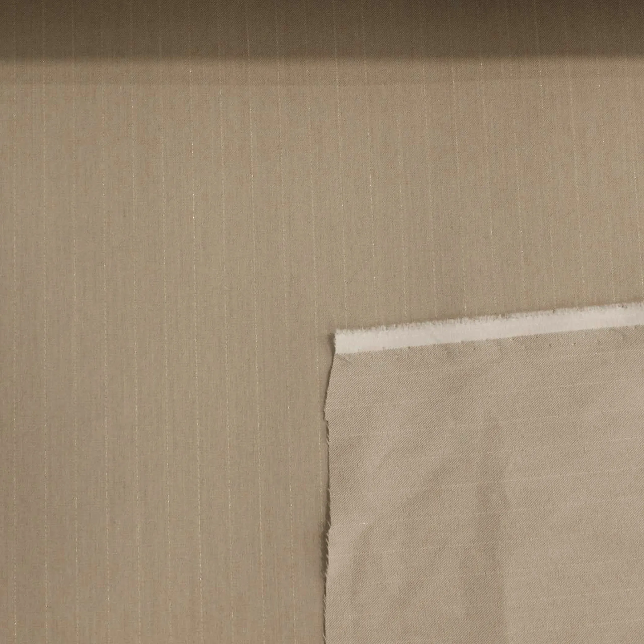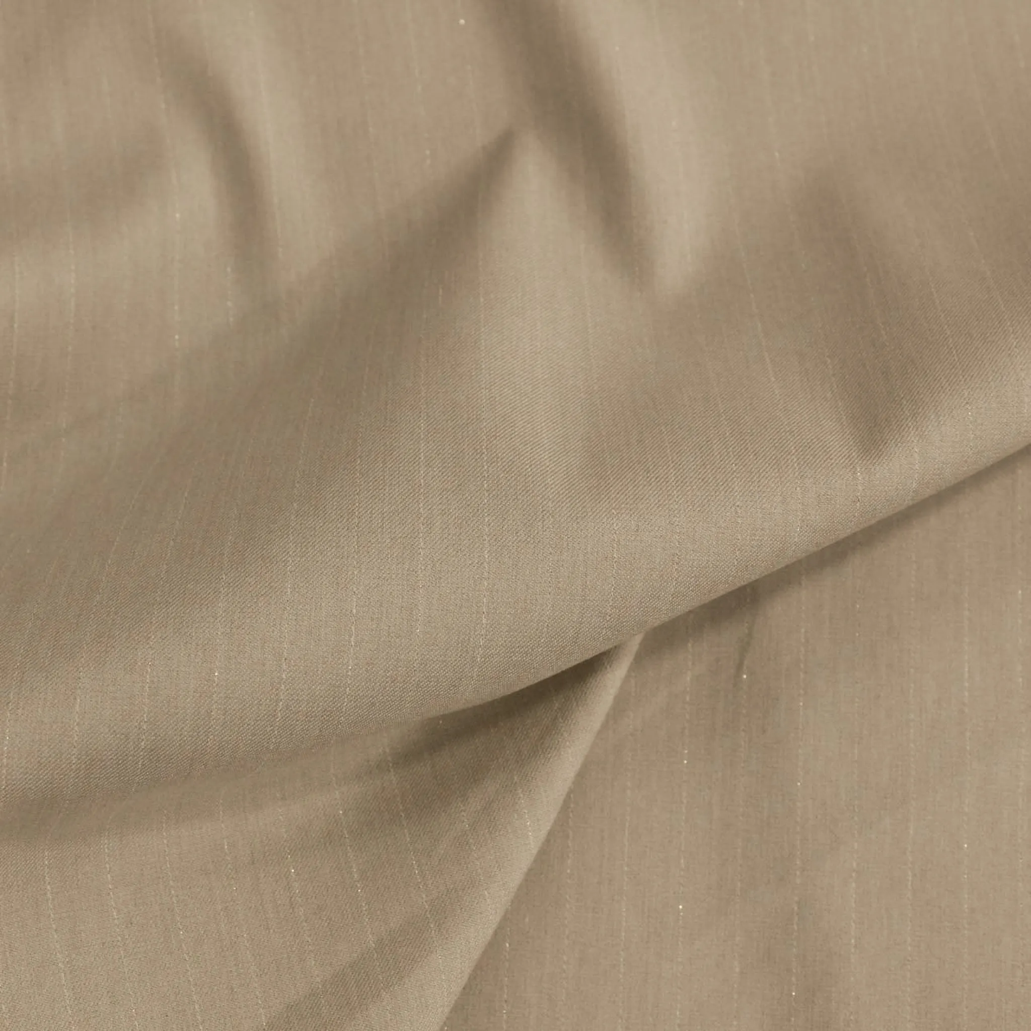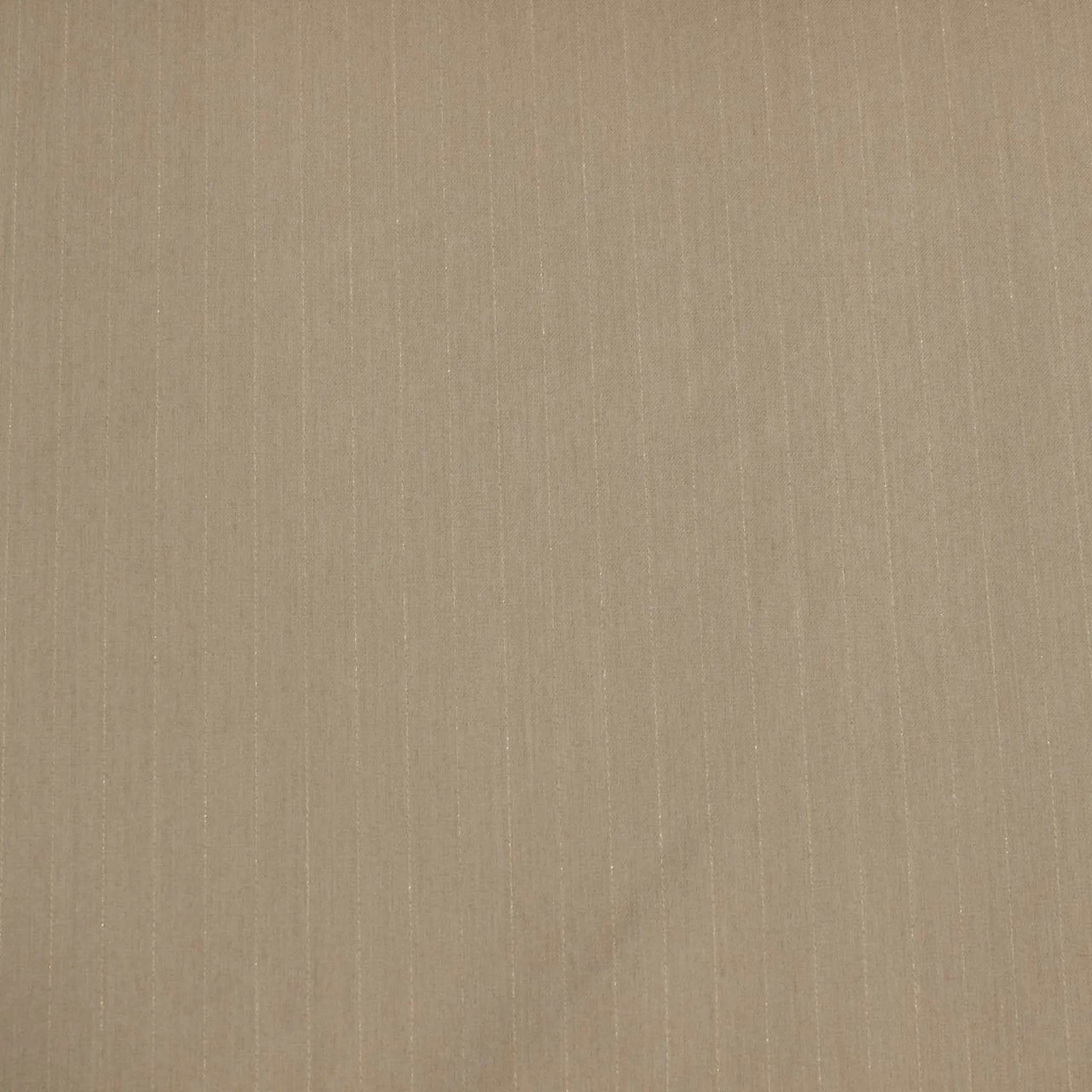 Tessuto gessato in poliviscosa elasticizzato colore beige con sottile filo lurex oro. Il tessuto ha una mano liscia, fluida e con una superficie opaca; risulta ideale per realizzare capi d'abbigliamento primavera - estate come giacche, pantaloni e gonne da donna . Le righe misurano 1 centimetro.