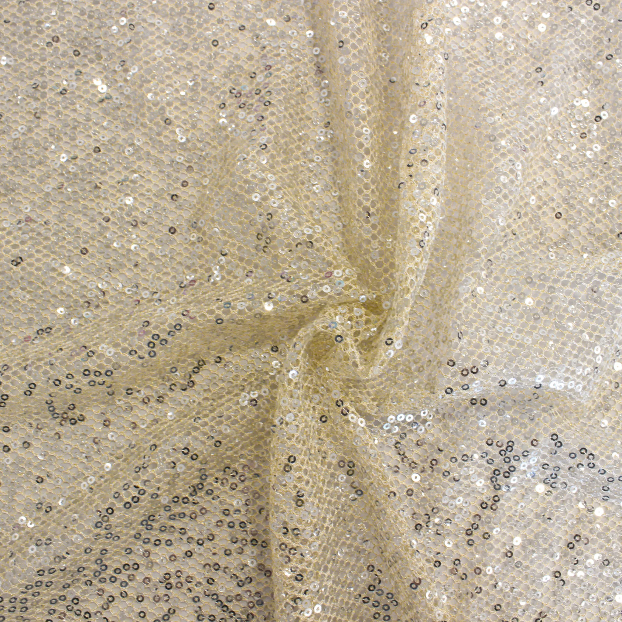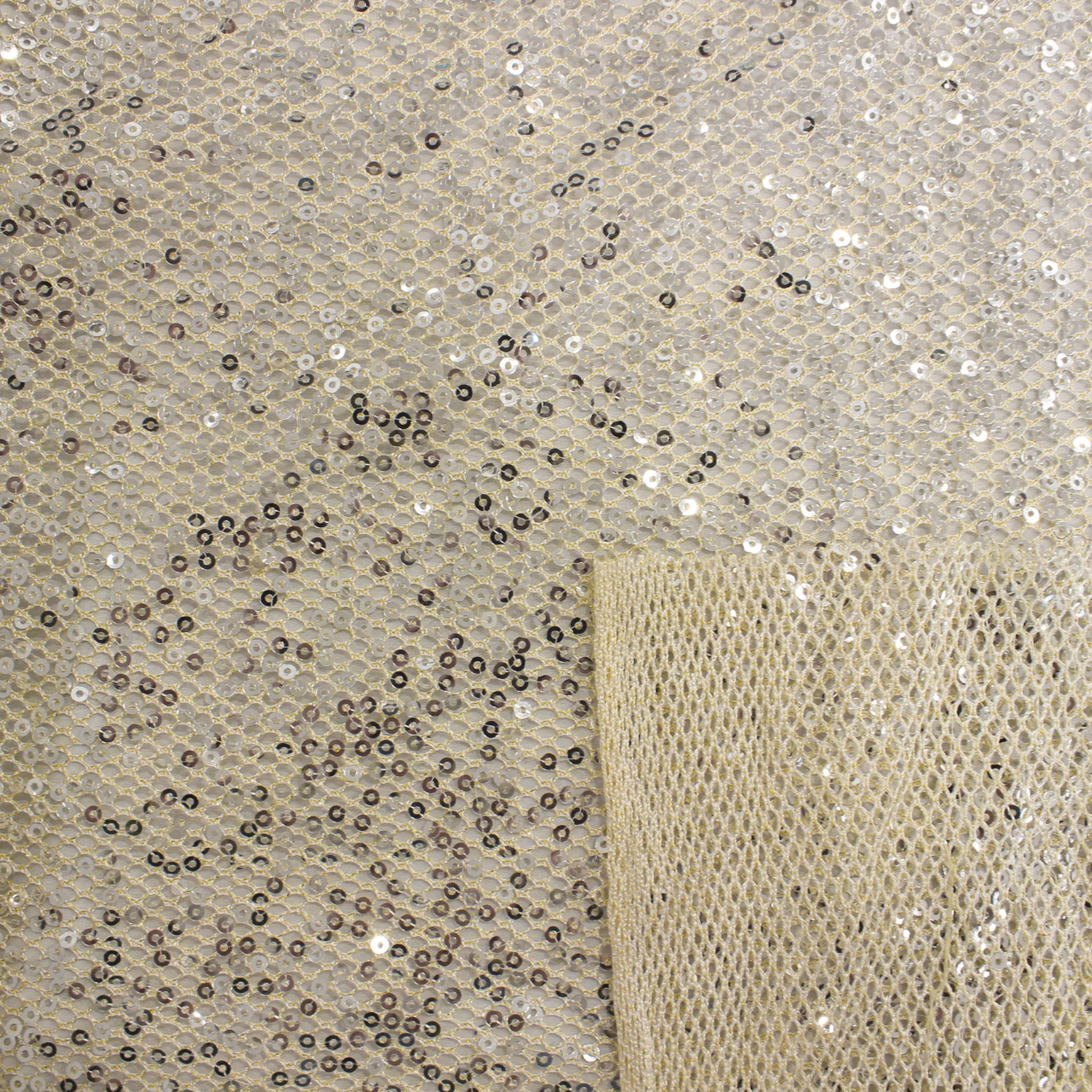 Luminoso tessuto in rete color oro lurex con paillettes di colore argento. Perfetto per realizzare capi d'abbigliamento come abiti eleganti o grintosi top e gonne .Il tessuto si presenta traforato e quindi trasparente .