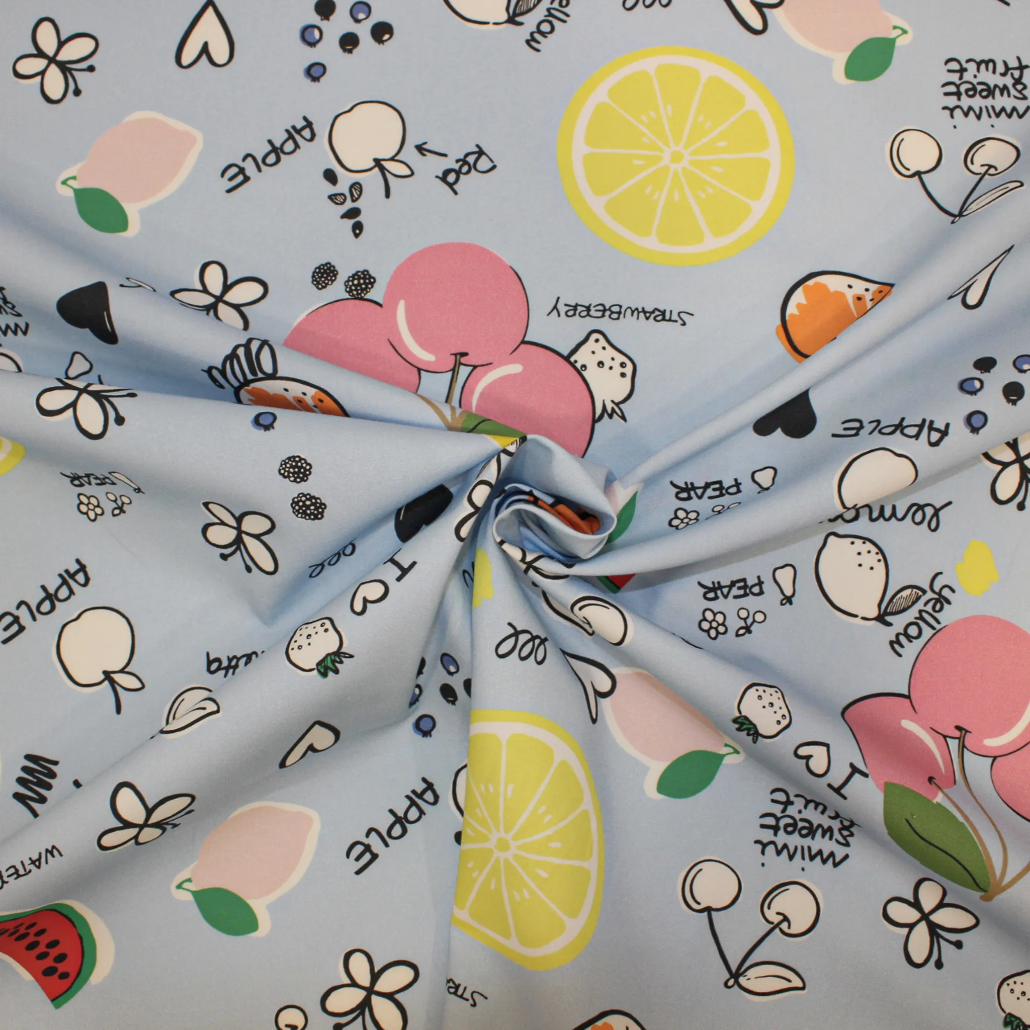 Tessuto in cotone fondo color celeste polvere con fantasia multicolor . E'una stampa italiana con frutti e scritte ; i motivi misurano circa 5 centimetri , questo cotone non è elastico e non è trasaprente, ha una superficie liscia ed opaca. Ideale per realizzare freschi capi donna, uomo o bambini come abiti, camicie , abbigliamento mare ,pantaoni ma anche lenzuola per bambine o tanti proggetti fai da te.