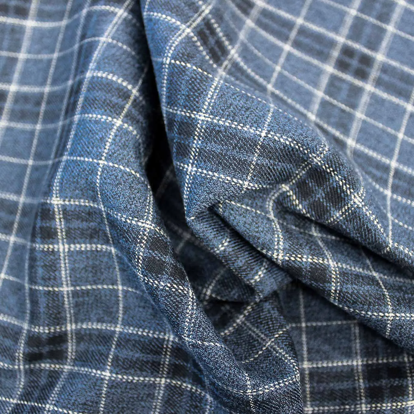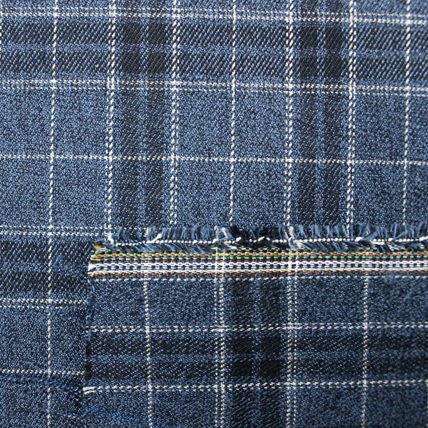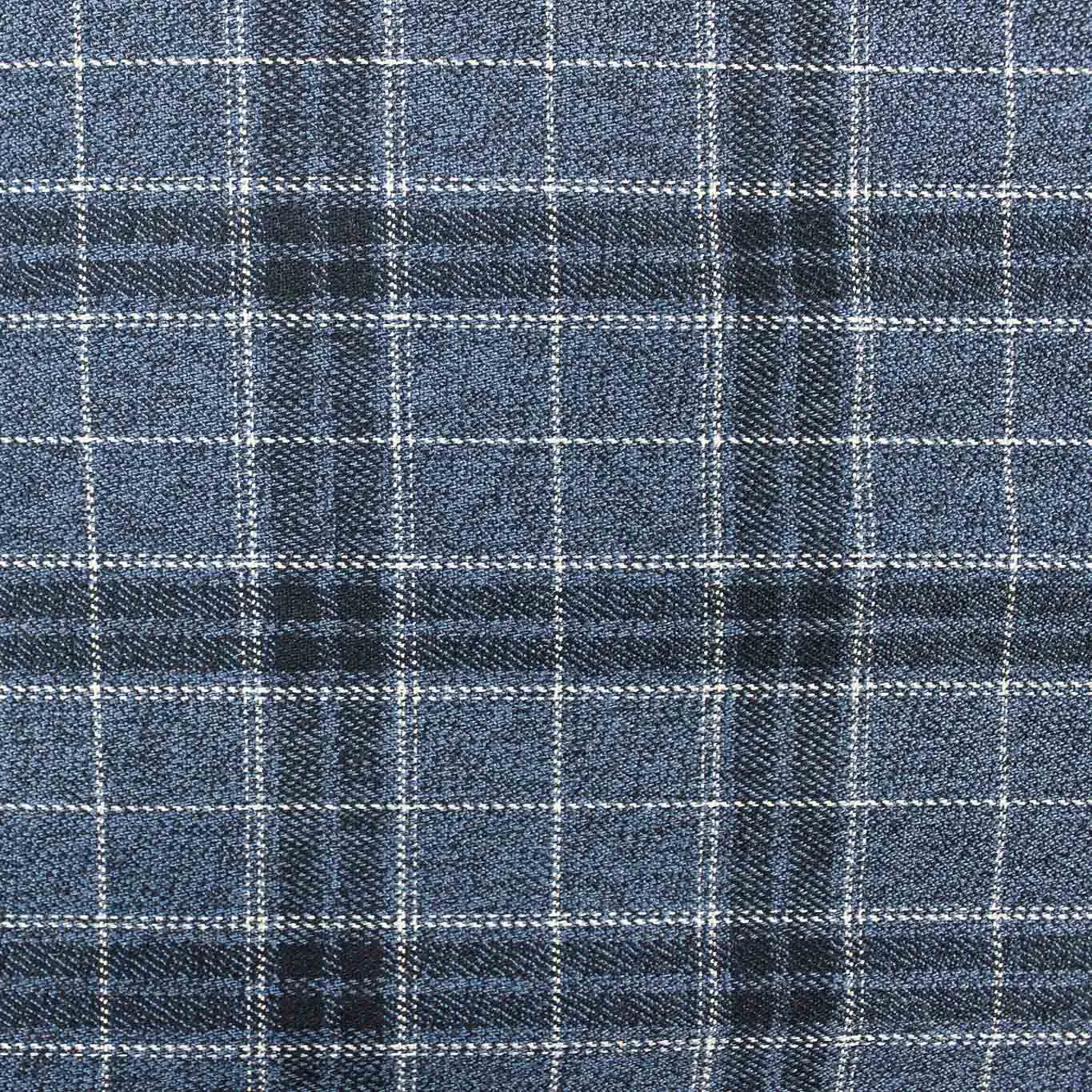 Caldo Tessuto Scozzese fondo blu quadri bianchi , tessuto in poliviscosa elestacizzato, ideale per realizzare pantaloni, giacche, gonne o abiti. Tessuto Certificato OEKOTEX.