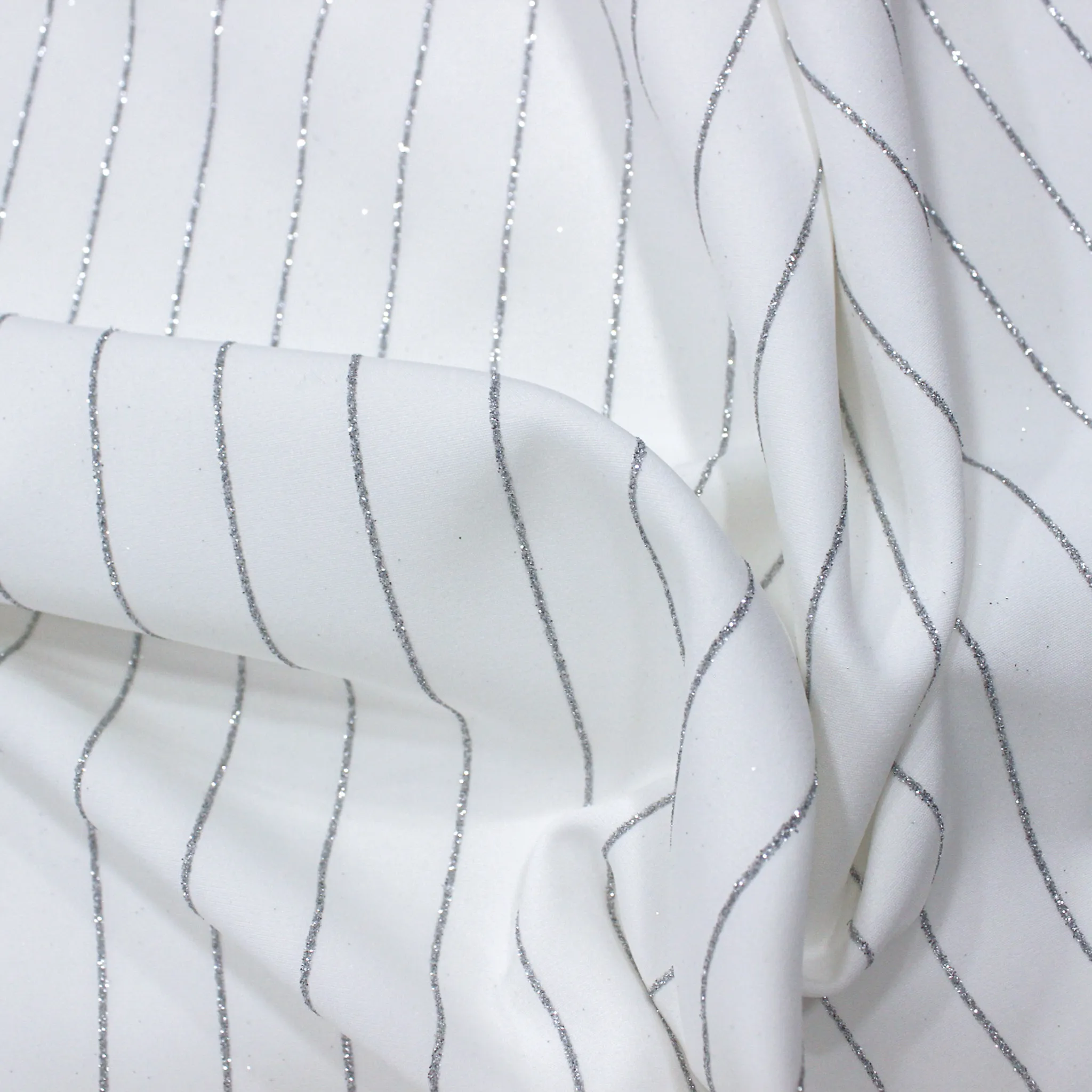 Versatile tessuto cady tecnico colore bianco con riga di colore argento lurex sottile che si distanzia dall'altra di 2 centimetri . Tessuto made in Italy,luminoso grazie al lurex leggermente in rilievo .E' ideale per realizzare abiti, giacche, pantaloni, gonne o completi. Questo tessuto può essere utilizzato per realizzare capi da donna primavera -estate.