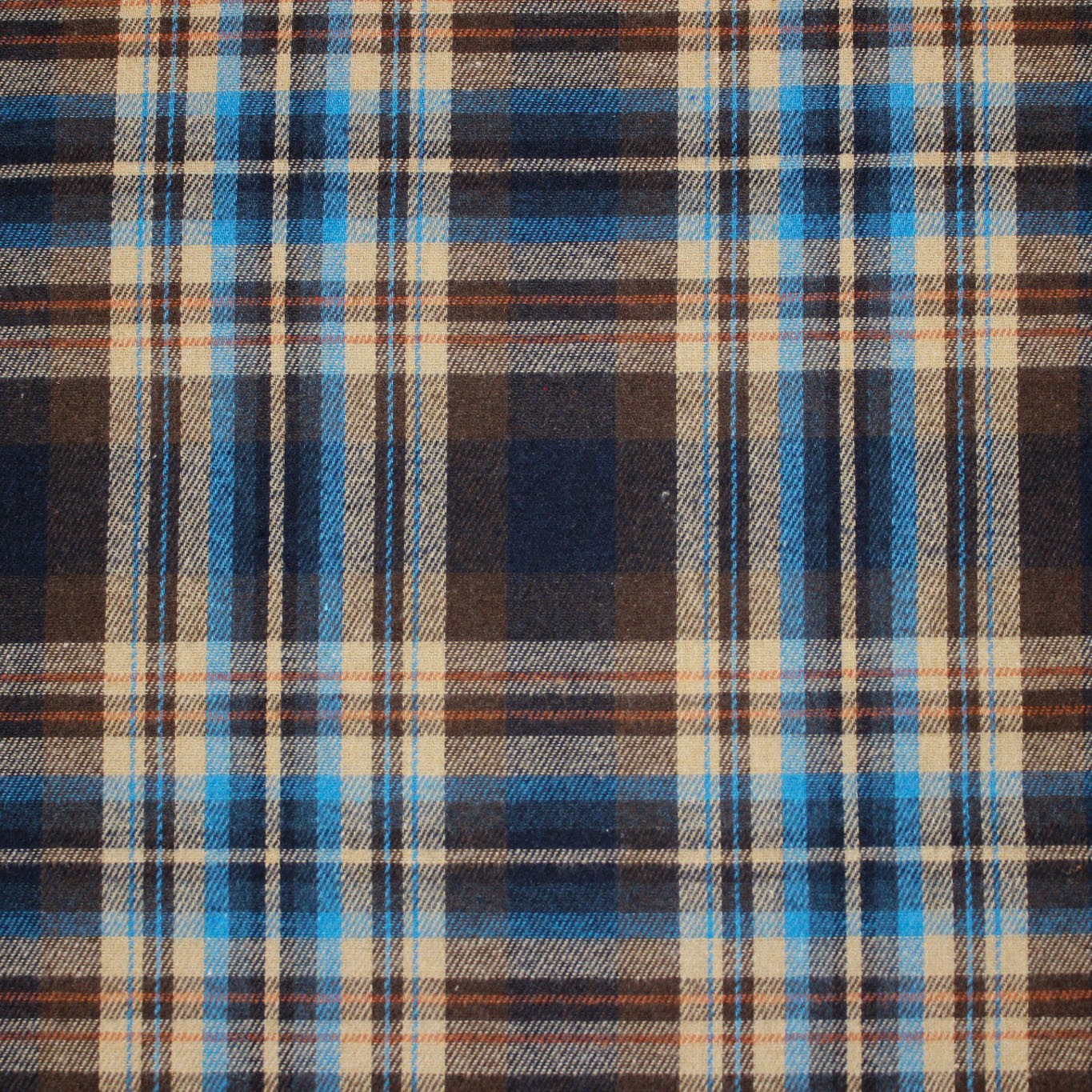 Questo tessuto scozzese in flanella presenta una fantasia tartan dal gusto heritage con una palette marrone e beige arricchita da accenti blu a contrasto, perfetti per collezioni casual-chic e capi da mezza stagione/inverno. La finitura tipo flanella dona una mano più morbida e confortevole, ideale per camicie, overshirt e capi layered.