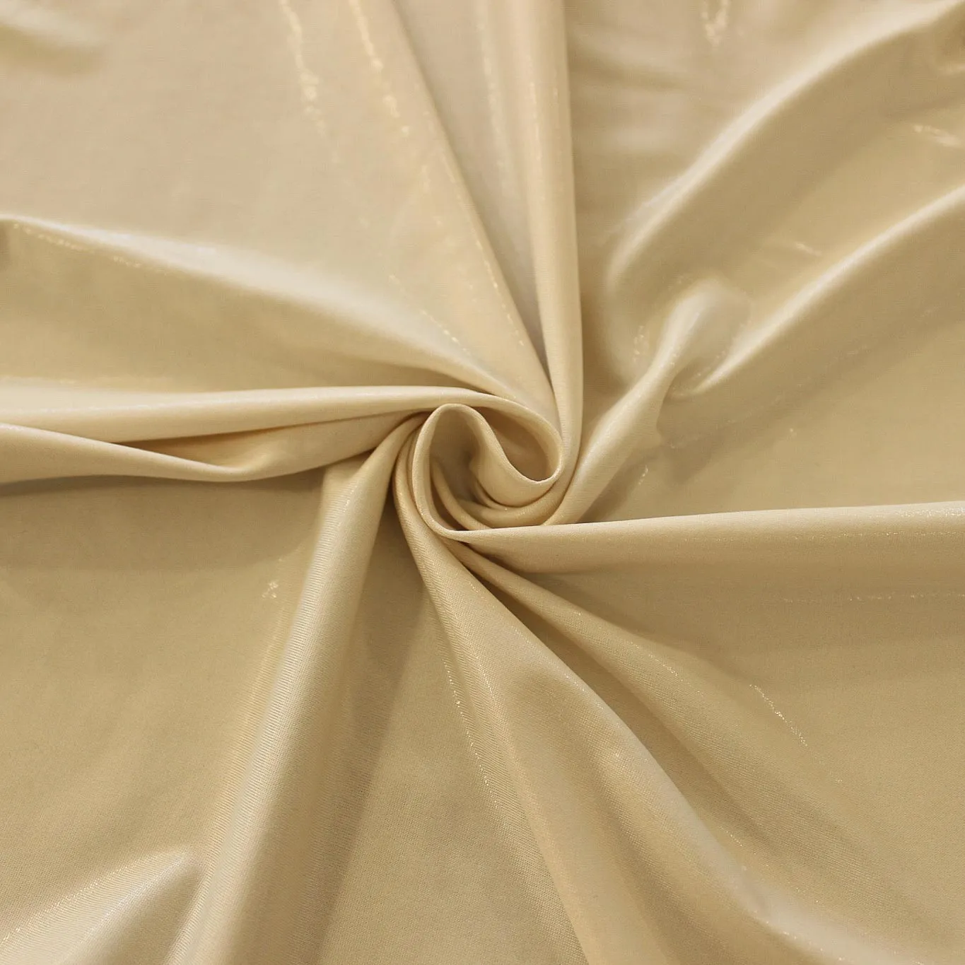 Luminosa maglina elasticizzata effetto spalmato di colore beige. Il tessuto ha una mano morbida e una superficie lucida, ideale per realizzare capi d'abbigliamento come abiti, bluse e top.